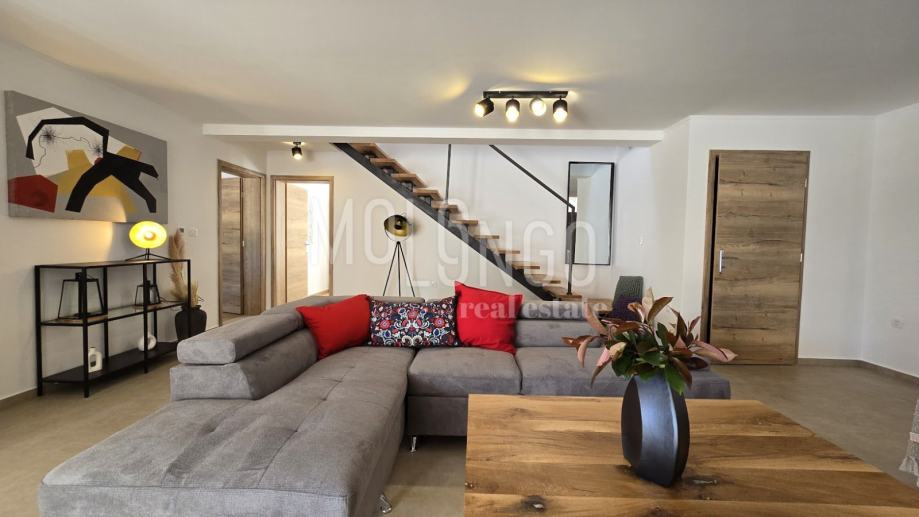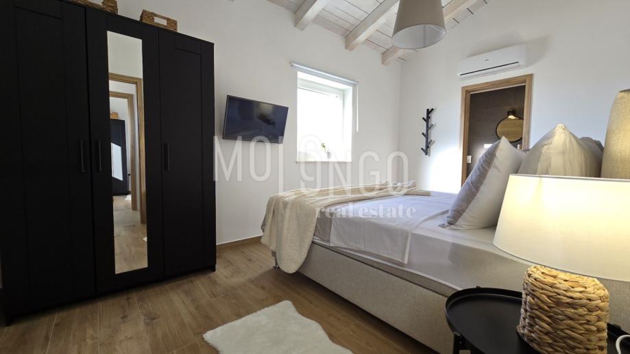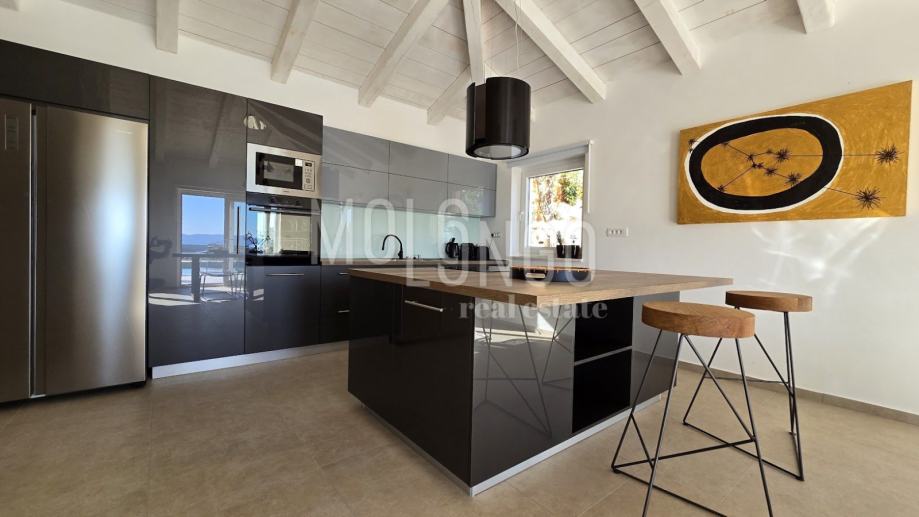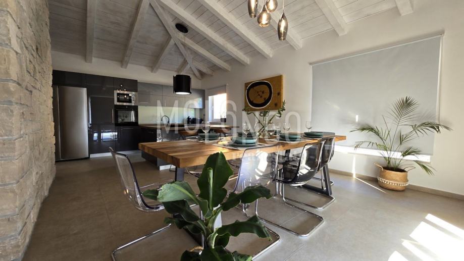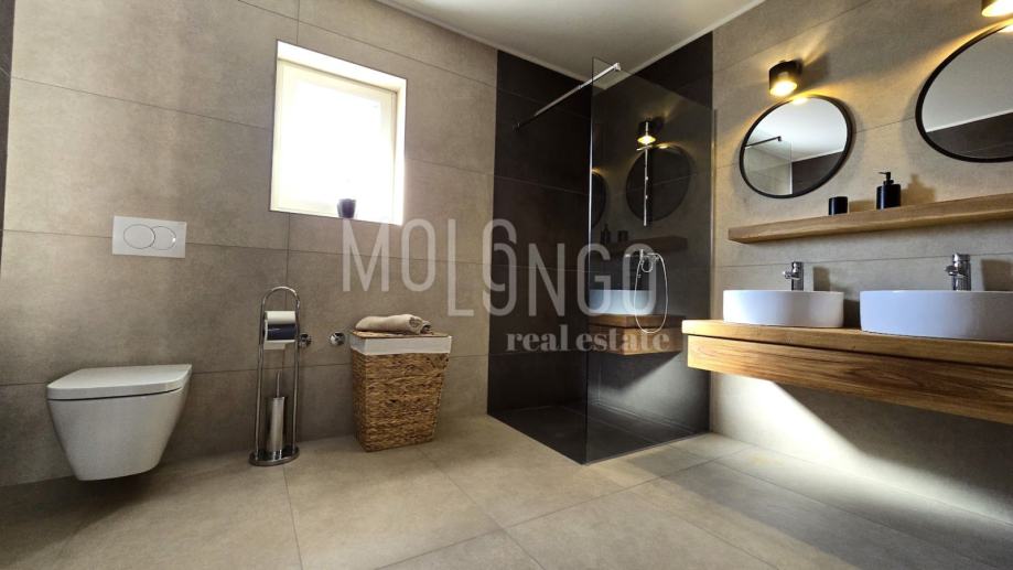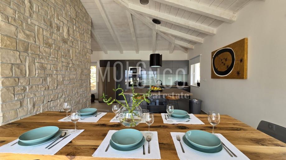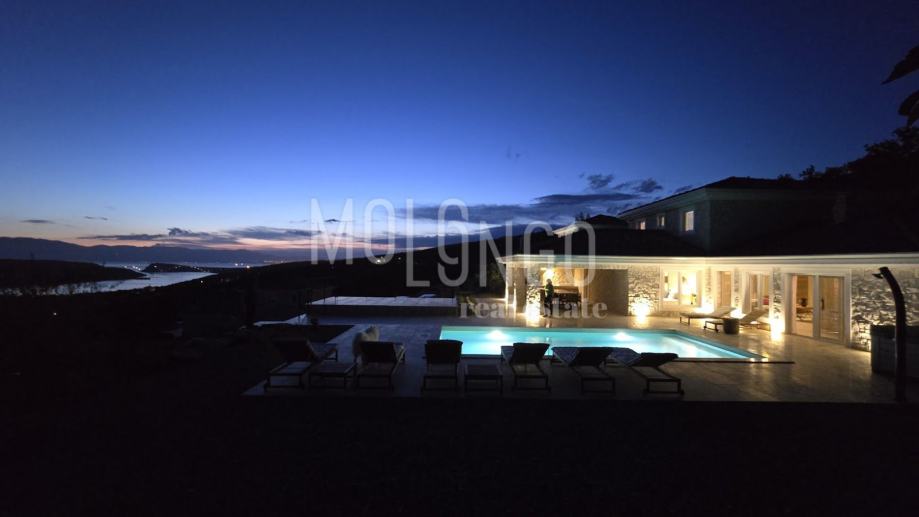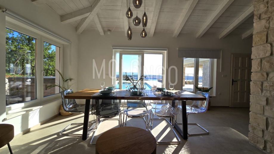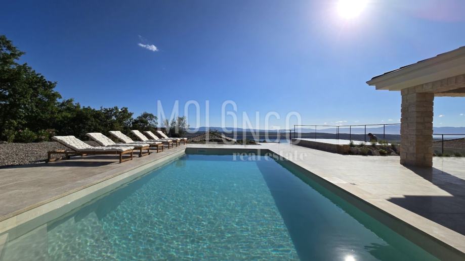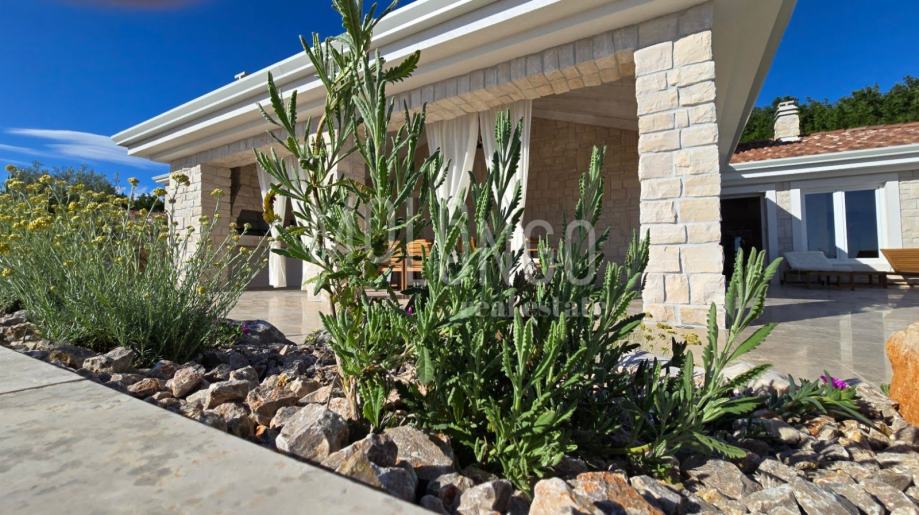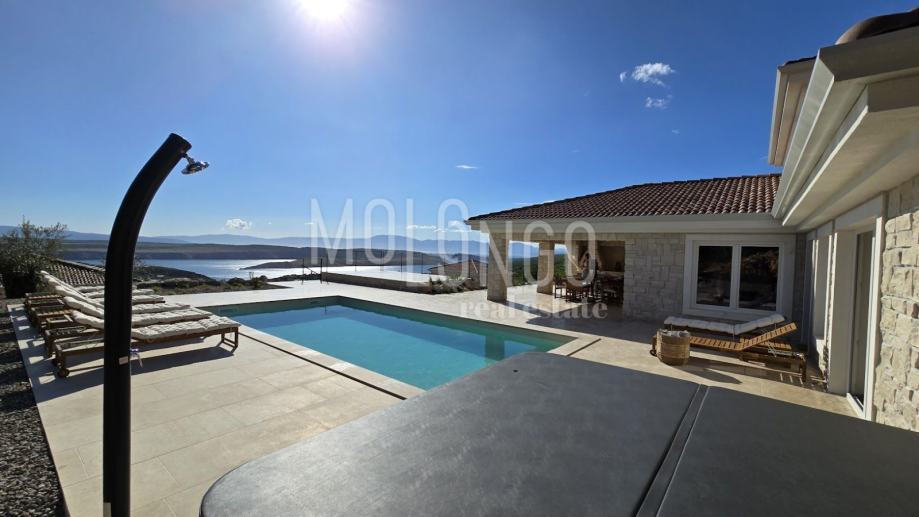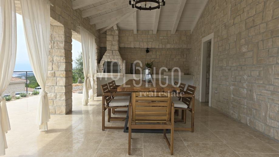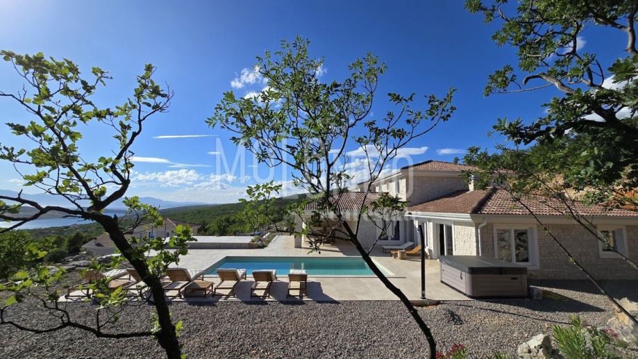 Kamena Villa je rustikalnog stila, sagrađena istarskim kamenom Kanfanar, površine 200 m2 + 36 m2 garaže + 10 m2 strojarnice + 35 m2 grijanog bazena s elektrolizom vode i postavljenom keramikom u bazenu, dok je ukupna površina zemljišta, koja je uređena autohtonim mediteranskim biljem, maslinama, prirodnim stijenama čak 1200 m2. Smještena na jednoj od najljepših lokacija na Kvarneru, u mjestu Jadranovo, vila predstavlja savršen spoj tradicije i luksuza. U svojoj unutrašnjosti skriva moderno opremljeni interijer sa svim potrebnim sadržajem za nesmetano uživanje u godišnjem odmoru iz snova ili stanovanje. Smještajnog kapaciteta za osam osoba, vila raspolaže s 4 spavaće sobe s ensuite kupaonicama. U prizemlju vile nalaze se dvije spavaće sobe, prostrani osvjetljeni dnevni boravak s dodatnim kaučem na razvlačenje za dvije osobe, te moderno opremljena kuhinja s blagovaonicom. Na gornjem se katu nalaze još dvije spavaće sobe s panoramskim pogledom na more. Čitav prostor je klimatiziran, ugrađena je dizalica topline (podno grijanje) i kamin. Na terasi vile, koja je popločana kamenom nalazi se prekrasni, keramikom obloženi grijani bazen s elektrolizom vode, veličine 35 m2 i dubine 1,7 m, zatim hidromasažna kada (jacuzzy) za 6 osoba, osam ležaljki za sunčanje s jastucima, vanjski stol za jelo od slavonskog hrasta te vanjski zidani kameni roštilj. U potpuno ograđenom dvorištu vile na raspolaganju su Vam i 2 parkirna mjesta u garaži. Vila je smještena na izoliranoj lokaciji daleko od gradske buke i vreve, te je okružena zelenilom i netaknutom prirodom gdje ćete moći uživati u mirisu čistog zraka i borovih stabala. Okolica pomorskog mjesta Jadranovo nudi pak raznovrsnu ponudu u kojoj će svatko pronaći nešto po vlastitom ukusu. Najbliža plaža udaljena je 900 metara od vile, gdje ćete moći uživati u kristalno čistom Jadranskom moru i zabaviti se uz vodene sportove poput plivanja, ronjenja, jedrenja ili ribarenja.