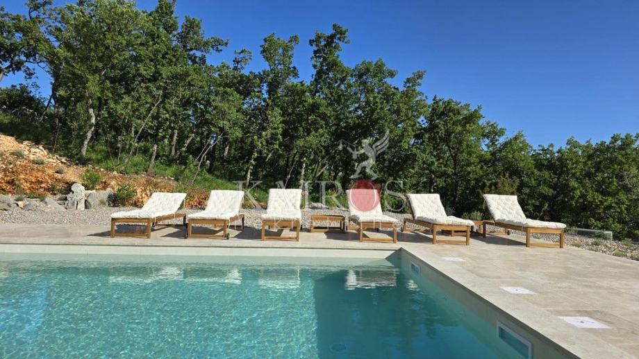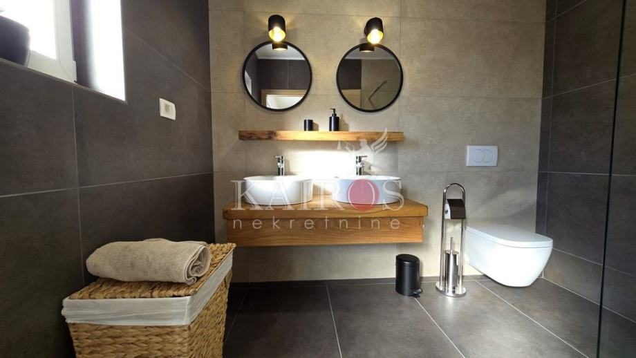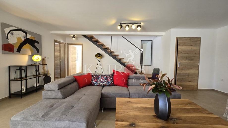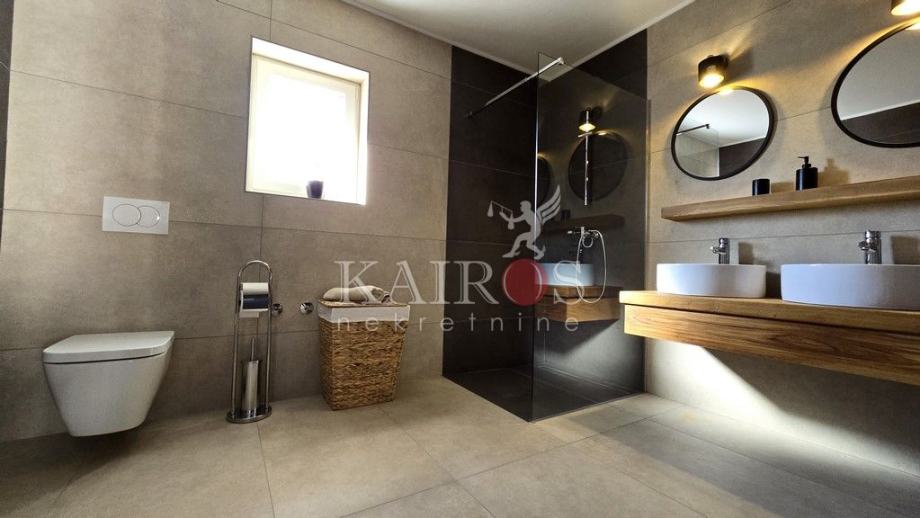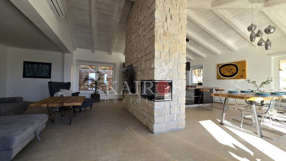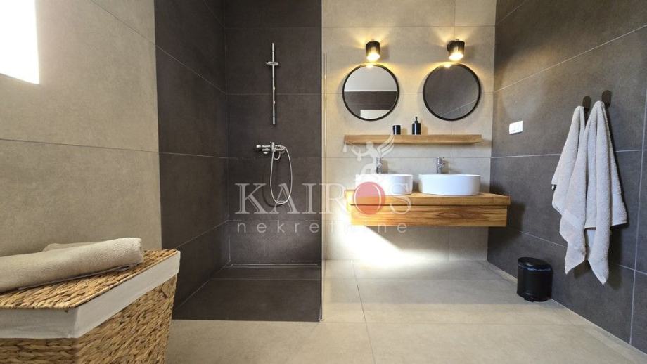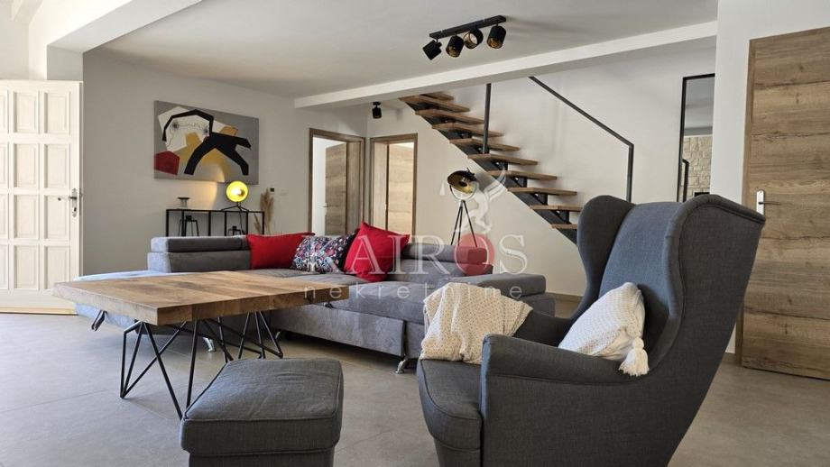 U prizemlju se nalazi veliki dnevni boravak s impozantnim kaminom te kompletno opremljena kuhinja. Iz dnevnog boravka je direktan pogled i pristup terasi i bazenu veličine 32 m2 koji je okružen ležaljkama i suncobranima. Do bazena se nalaze roštilj i vanjski stol, idealan za večere i druženja s obitelji i prijateljima. Uz sve navedeno, na raspolaganju je i jacuzzi, fitness, vanjski tuš i parkirna mjesta unutar i van dvorišta.