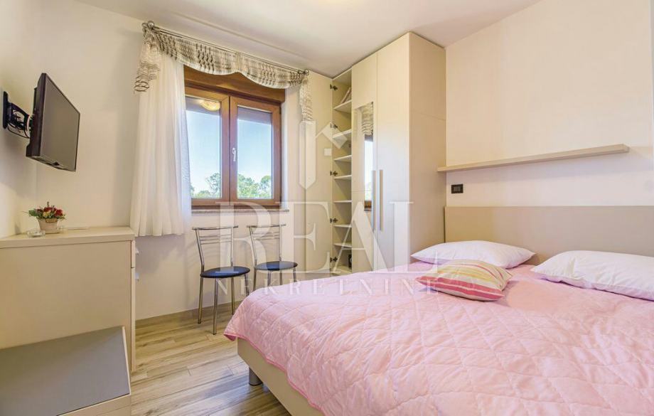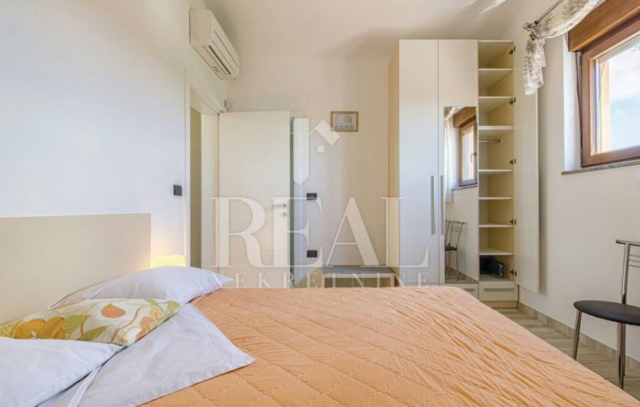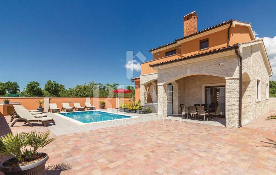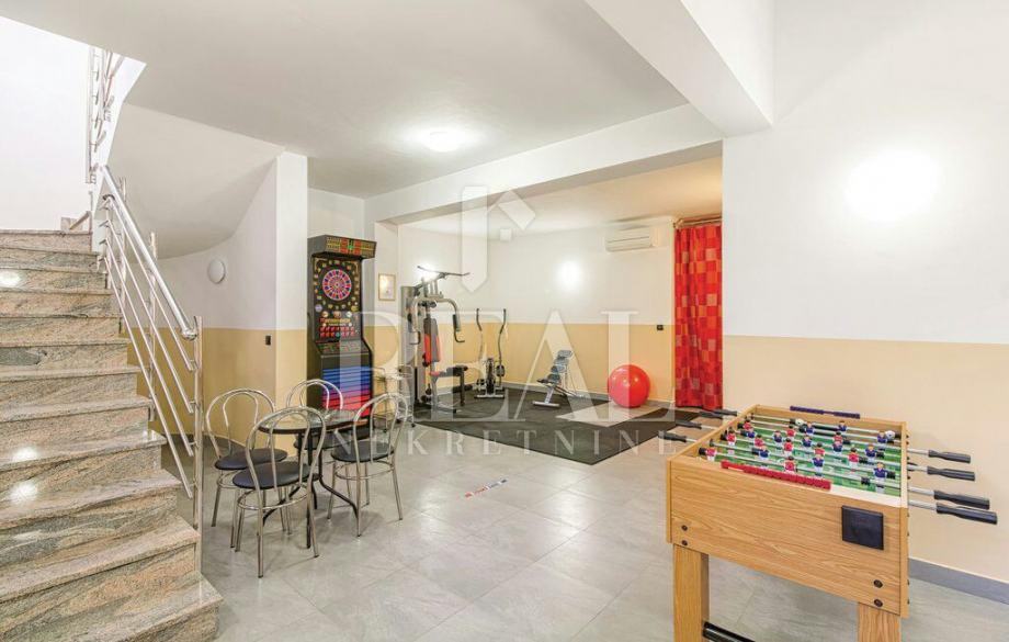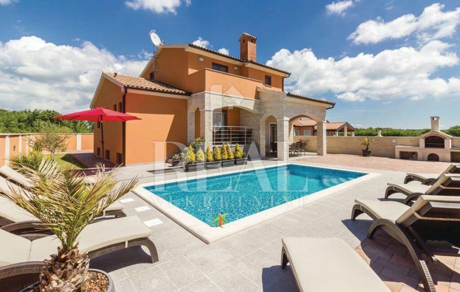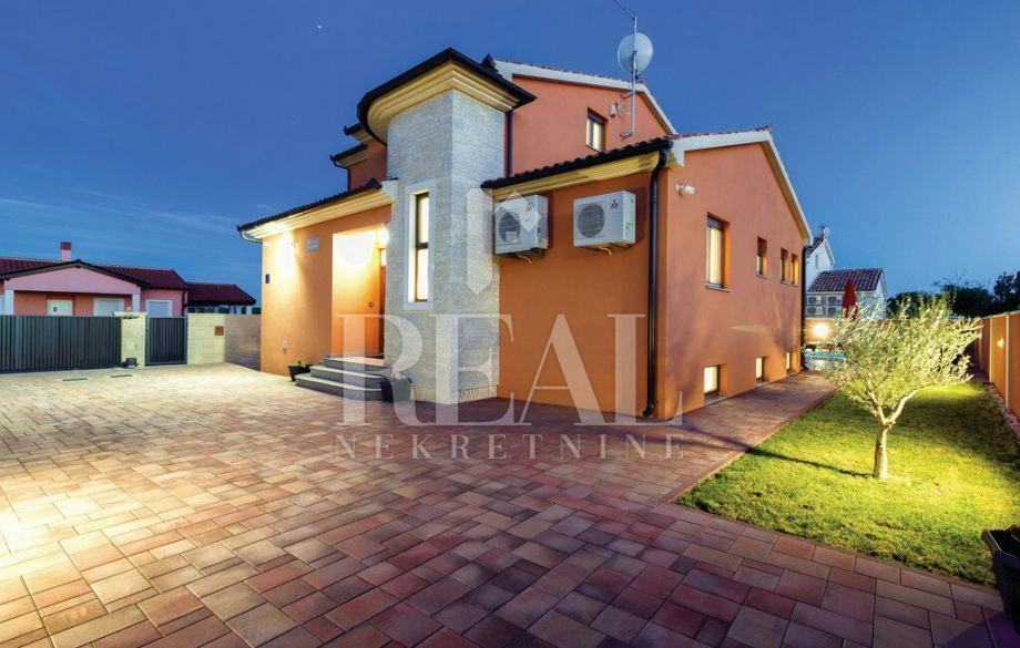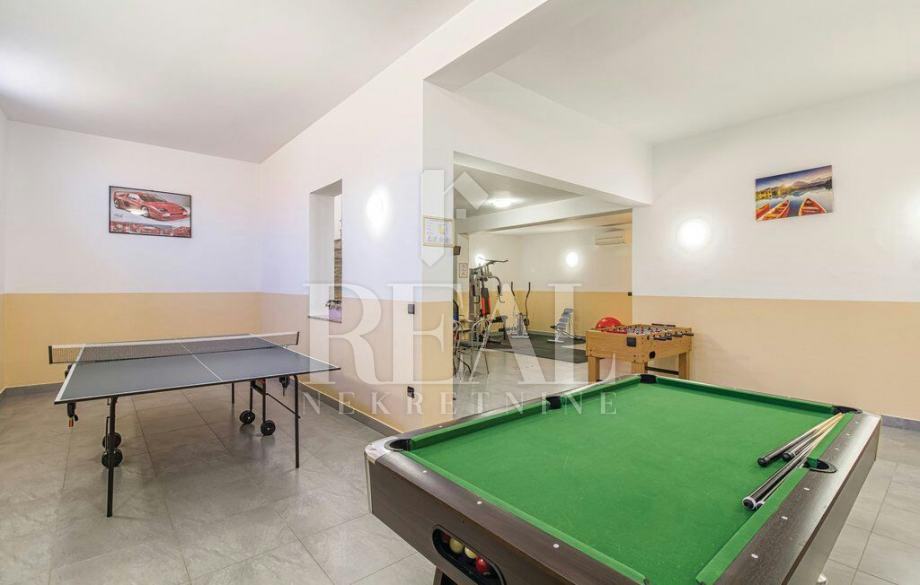 Prekrasna samostojeća kuća 337m2 stambenog prostora i 550m2 okućnice.Sastoji se od podruma ,prizemlja te 1. kata.U podrumu objekta je smiještena teretana i soba za bilijar dok je u prizemlju prostran dnevni dio sa kuhinjom i blagavaonicom,kupaonica,natkrivena terasa i jedna spavaća soba sa kupaonicom.Prvi kat pokrivaju tri spavaće sobe svaka sa vlastitom kupaonicom i terasa sa pogledom na bazen.Grijanje je na klima uređaje ukupno 5 komada i kamin na kruta goriva,također imamo i kolektor za toplu vodu.Veći bazen od 32m2 nalazi se na uređenoj okućnici, vanjski roštilj te ostava, parking za četiri vozila.Kompletno namještena kuća i kao takva se i prodaje.Udaljenost od plaže za kupanje cca 2 km.