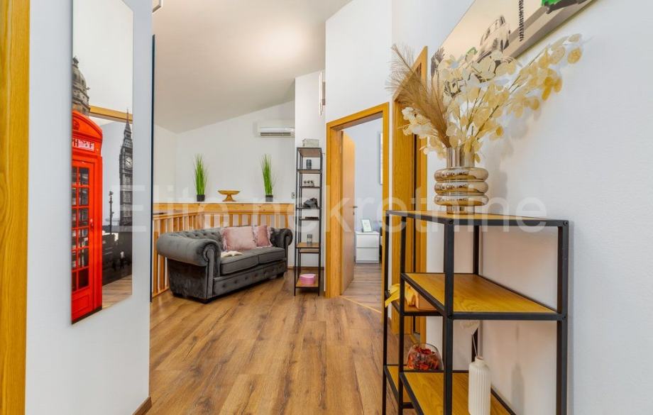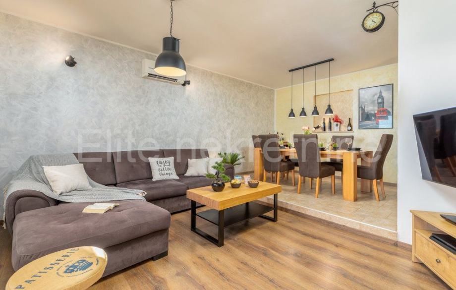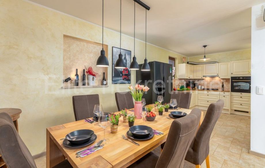 Kuća je koncipirana na način da se prizemlje sastoji od prostranog prostora u kojem je smještena blagovaonica, novoopremljena kuhinja, spremište, kupaonica i prostrana ljetna terasa.
