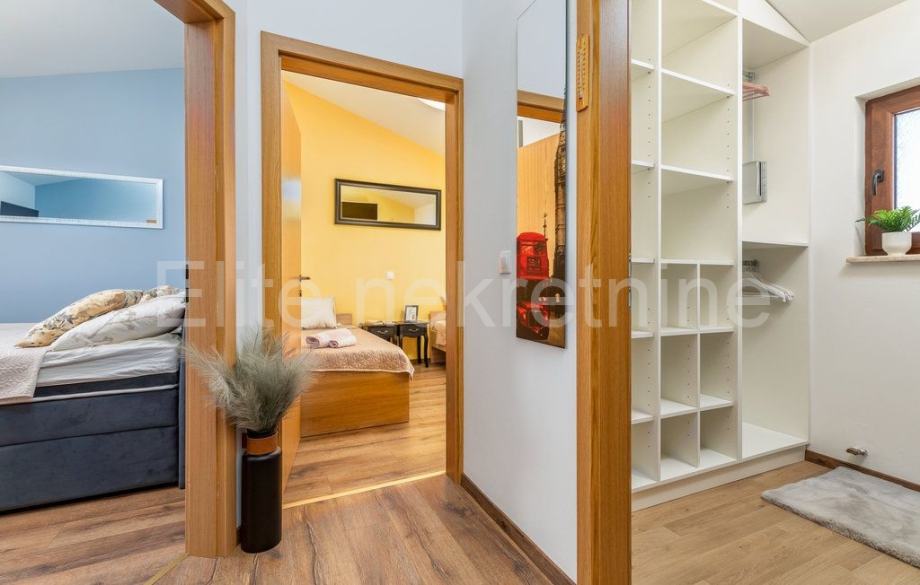 Na prvom katu istaknute kuće nalazi se hodnik, kupatilo i tri spavaće sobe od kojih jedna ima izlaz na terasu sa koje seže otvoreni pogled na prekrasno dvorište s bazenom i zelenilo.