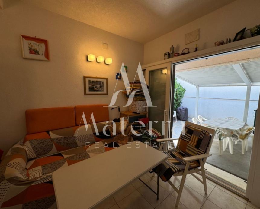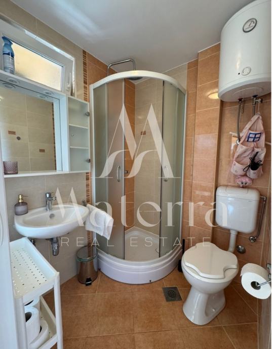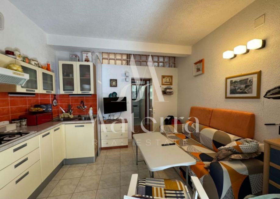 PRIZEMLJE se nalazi stan veličine 35,55m2 koji se sastoji od ulaznog hodnika, kupaonice, spavaće sobe sa ugradbenim ormarom i potpuno opremljene kuhinje i dnevnog dijela otvorenog tlocrta iz kojeg se izlazi na prostranu vanjsku terasu sa pergolom i dijelom predviđenim za vanjsku kuhinju. Stan posjeduje spremište.