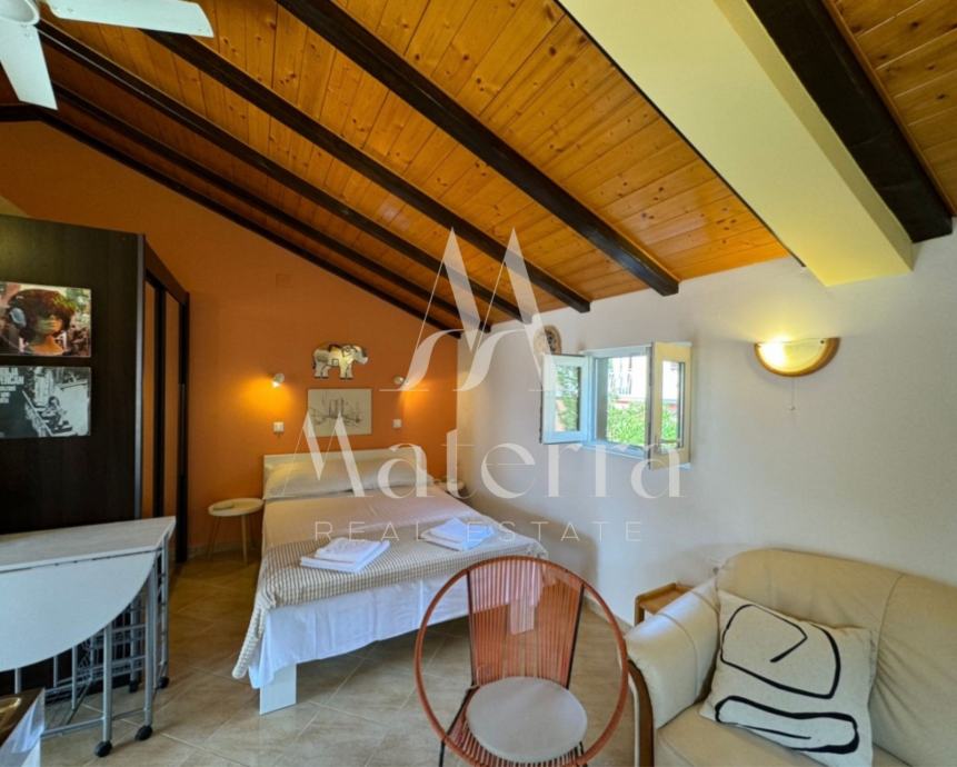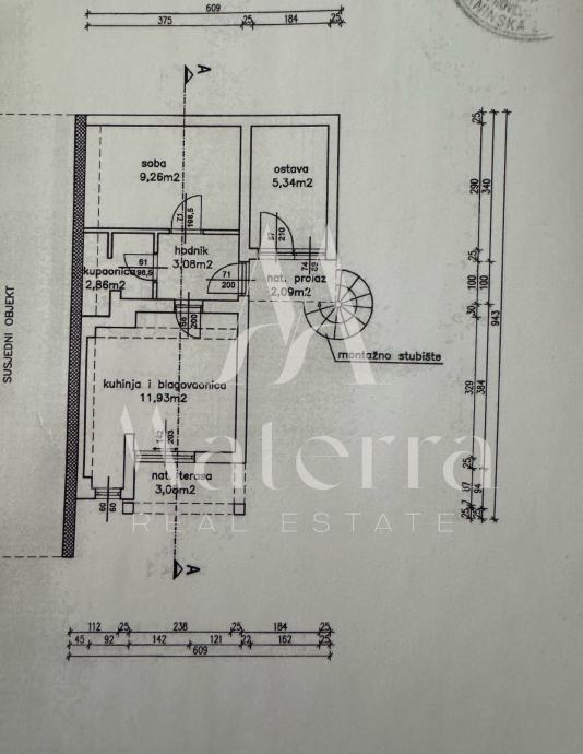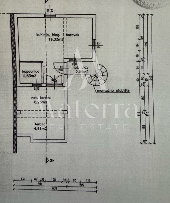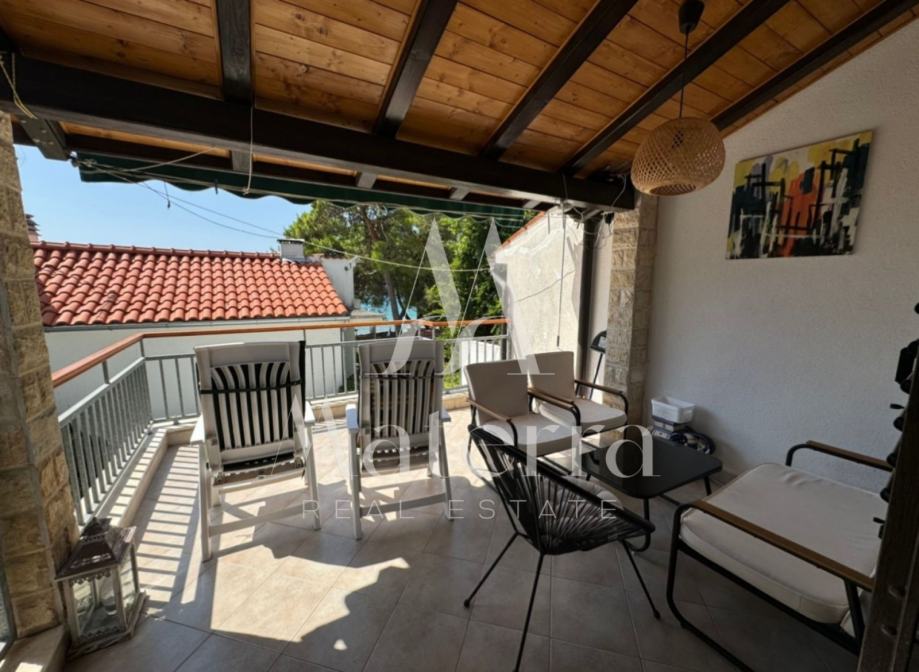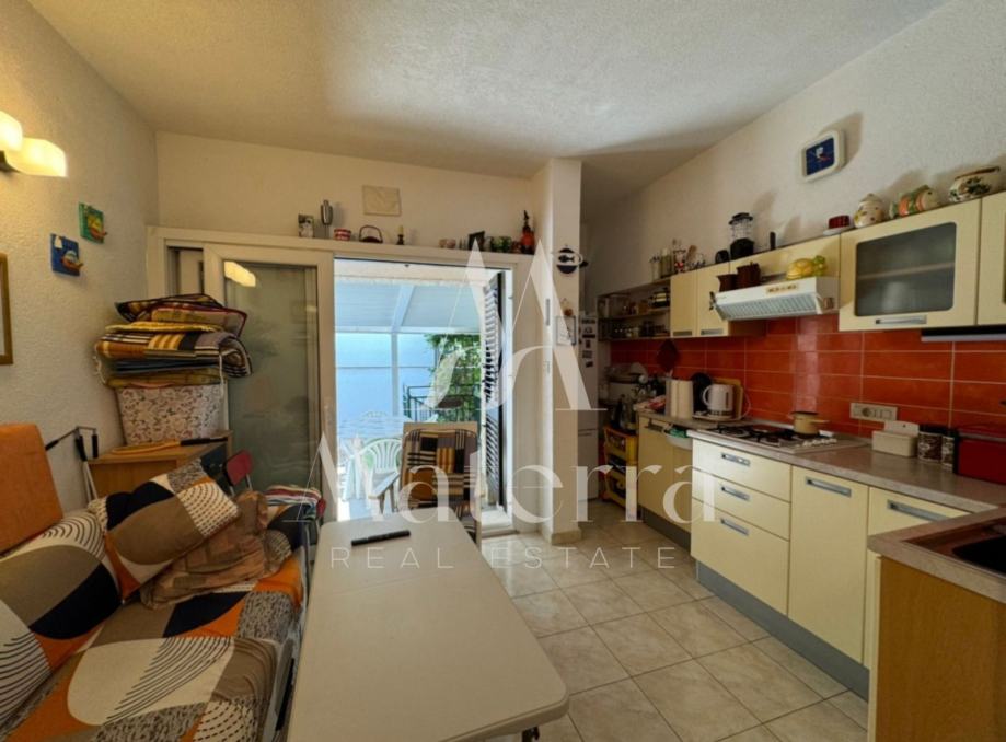 KAT: vanjskim spiralnim stepenicama se dolazi na kat gdje se nalazi stan veličine 36,56m2 Stan je koncipiran kao studio sa velikom terasom i pogledom (dijelom natkrivena), Stan posjeduje spavaći dio spojen sa dnevnim dijelom i kuhinjom, kupaonicu i prostranu terasu sa pogledom na zelenilo i more.