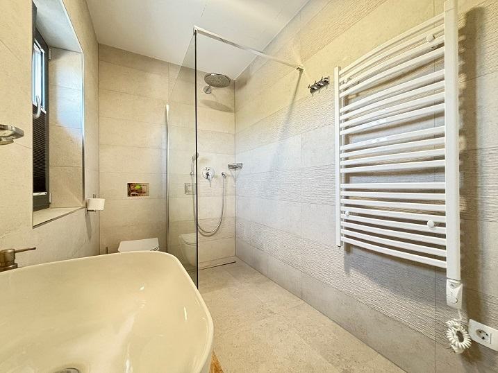 U prizemlju vile se nalaze dnevni boravak s kaminom, kuhinja, soba su kupaonom, wc, vešeraj i više spremišta. Stepenicama se dolazi na kat.