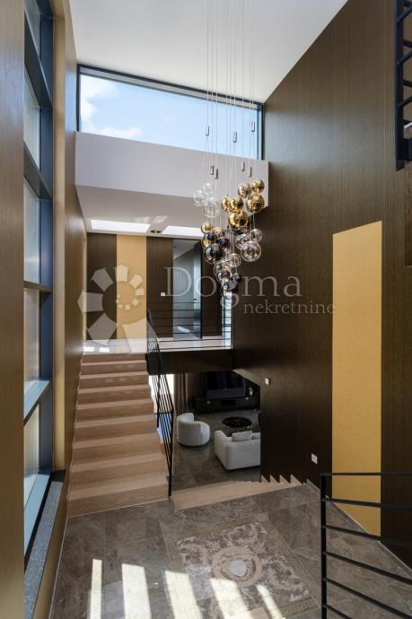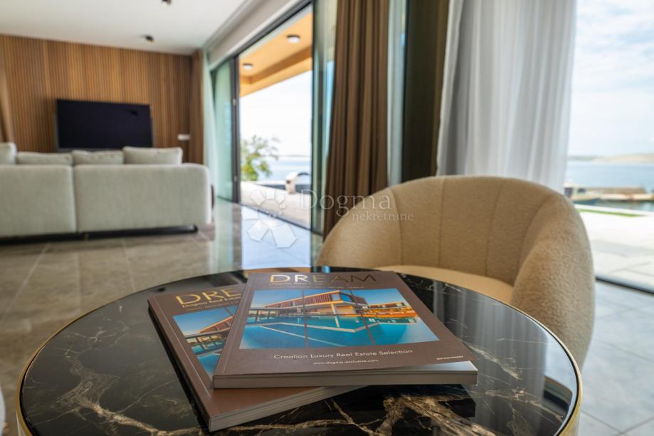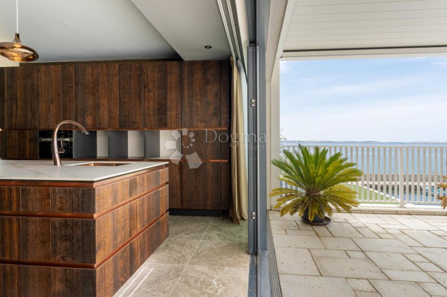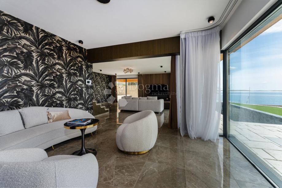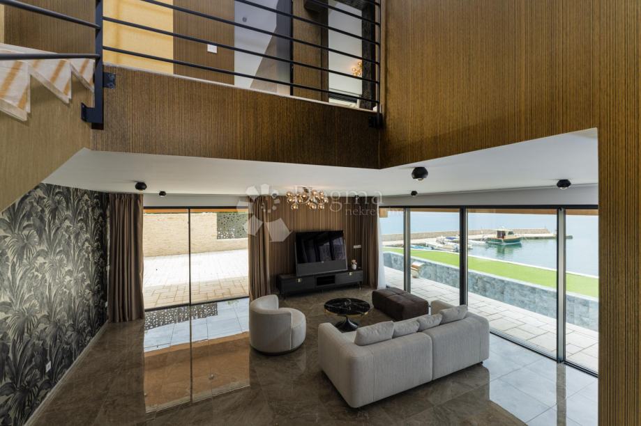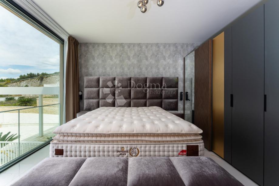 The villa is in the 1st row to the sea and designed so that 180 degrees around you azure blue opens up indefinitely. The fence surrounding the property has Brač stone all over it, and the staircase leads directly from the terrace of the villa to the beach, where you have your own boat mooring. The ground floor consists of a living room with access to two terraces, one of which has a heated swimming pool, and everything around it is a space for socializing, outdoor seating or sunbathing. Furthermore, there is a unique custom-made kitchen with a spacious dining room and guest toilet. On the top floor, there are a total of 4 bedrooms with access to the outdoor area and 3 bathrooms. The villa has 357 m2, and the plot on which it is located has 1341 m2.