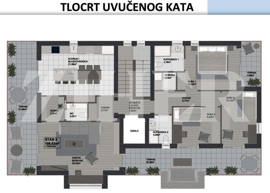 Stan 3 - sastoji se od dnevnog boravka, odvojene blagavaonice i kuhinje, master spavaće sobe s kupaonicom, vešeraja, još dvije spavaće sobe, druge kupaonice, wc-a, zatvorene površine 109 m2 + tri terase površina 21 m2, 20 m2 i 5 m2, ukupne prodajne površine 120,12 m2 = cijena 342.342 eura.