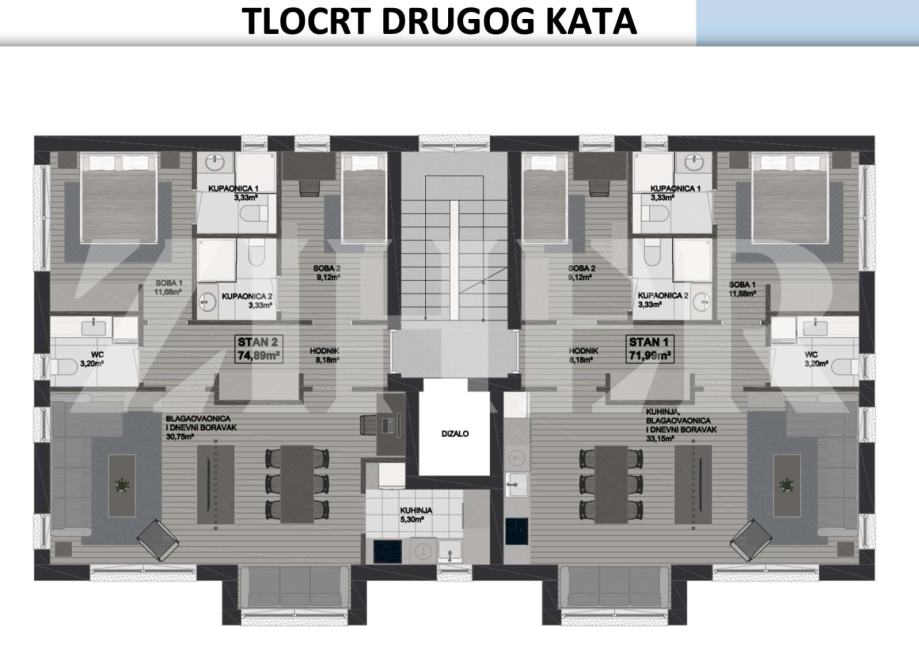 Stan 2 - sastoji se od dnevnog boravka s blagavaonicom i kuhinjom, dvije spavaće sobe, svaka sa svojom kupaonicom i wc-a, ukupne površine 74,89 m2 = cijena 213.436 eura