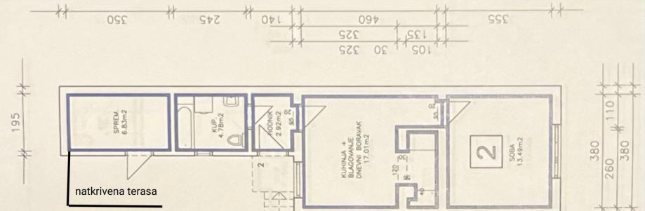 Stan je stambene površine 38.2 m2 + spremište 6,83 m2 (sa koeficijentom 3.41 m2) + natkrivena terasa površine 12.44 m2 (sa keoficijentom 6.22 m2) tako da je sveukupna korisna površina stana 47.84 m2.