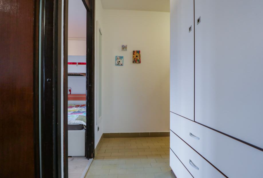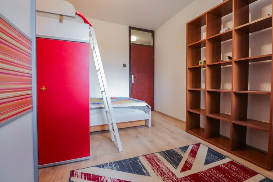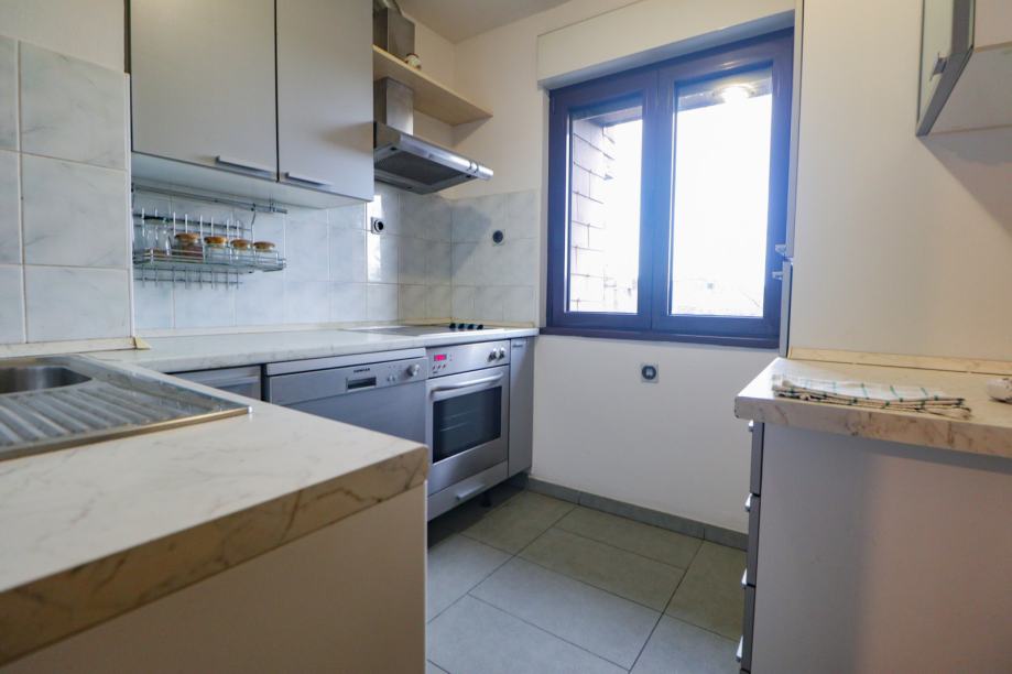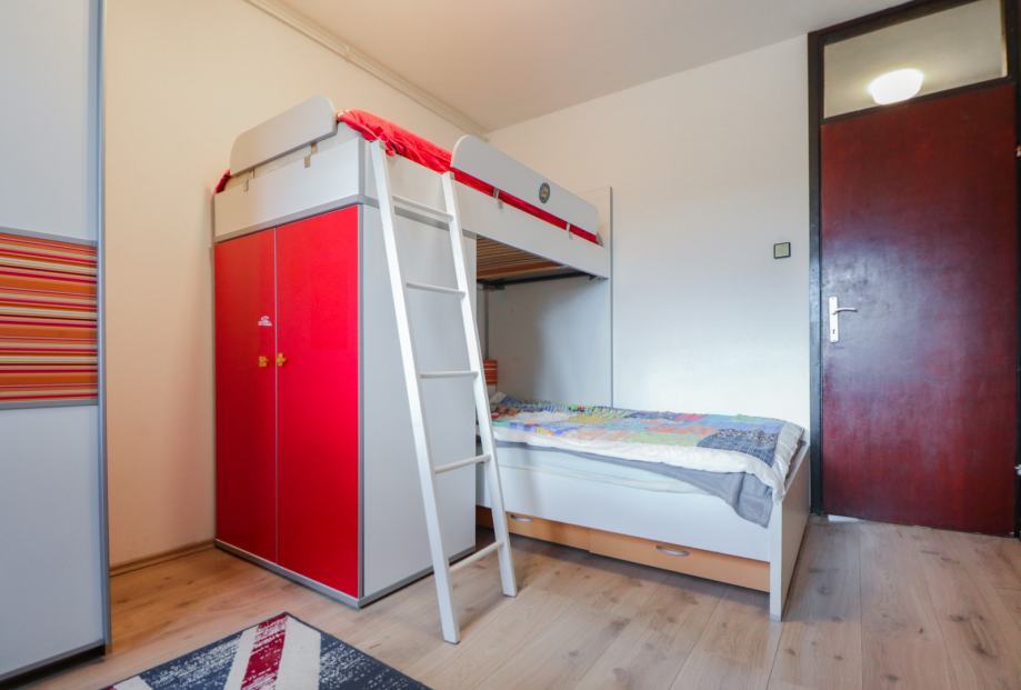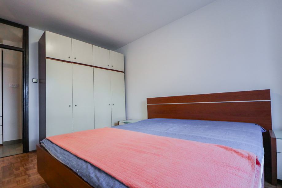 U potpunosti je namješten i opremljen je klima uređajem, ugradbenim ormarima, aluminijskom stolarijom s izo staklima, hrastovim parketom, perilicom posuđa, perilicom rublja, hladnjakom s ledenicom, pećnicom, napom, štednjakom i sl. Jedna soba je opremljena bračnim krevetom dok su u drugu smješteni jednostruki kreveti na kat.
