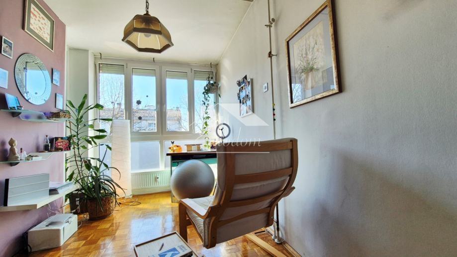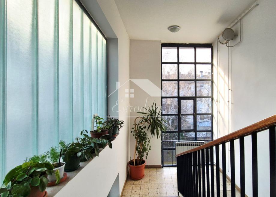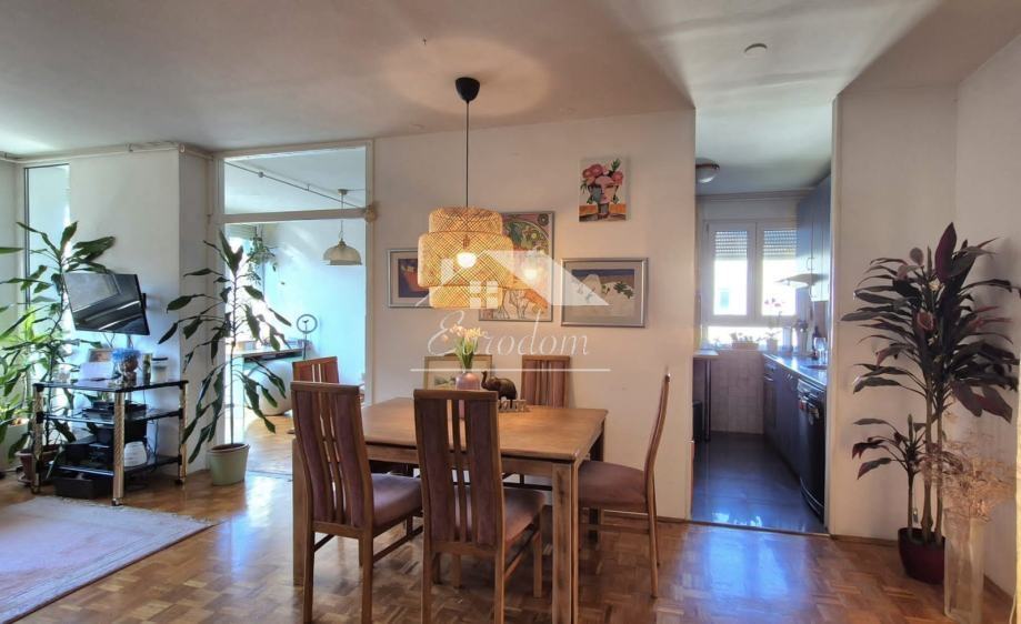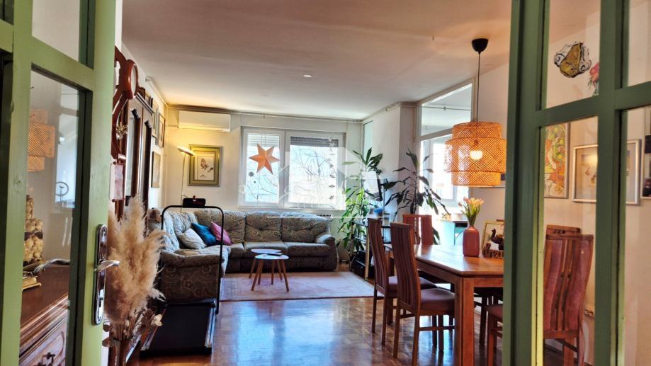 Stan ukupne obračunske površine 94,85 m² (netto stambena površina 92,35 m² + spremište u podrumu 5 m², obračunski 2,5 m²) nalazi se na mirnoj mikrolokaciji s pogledom na zelenu površinu i otvorenim prostorom između zgrada, što osigurava obilje svjetla, zraka i privatnosti.