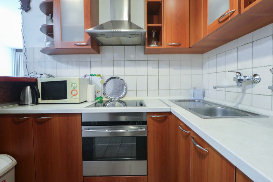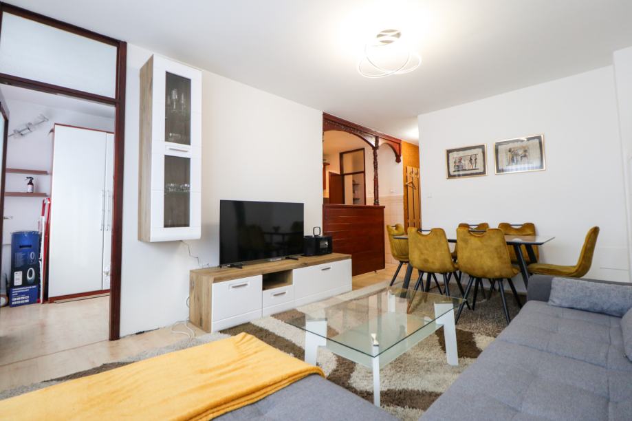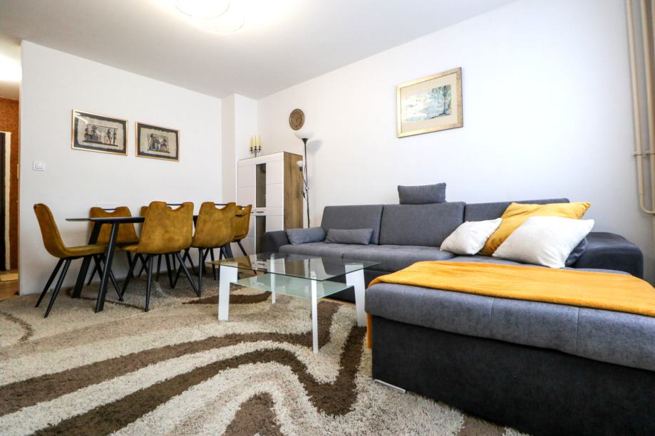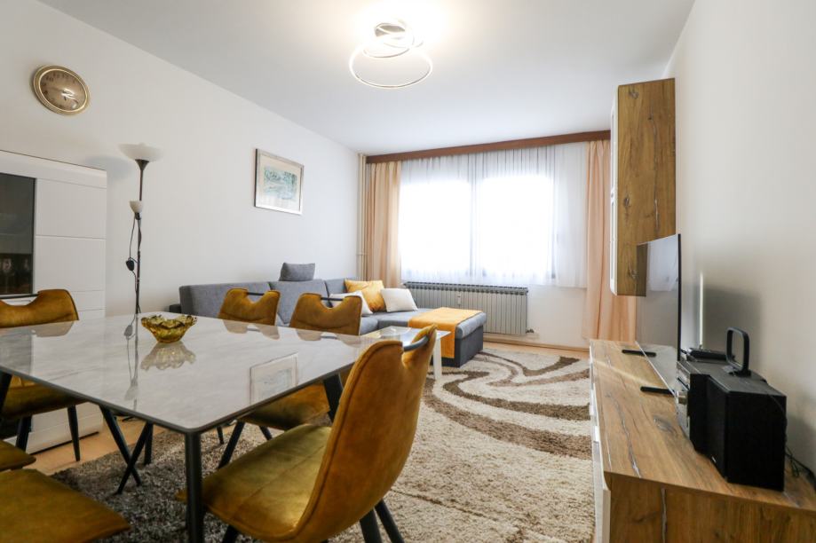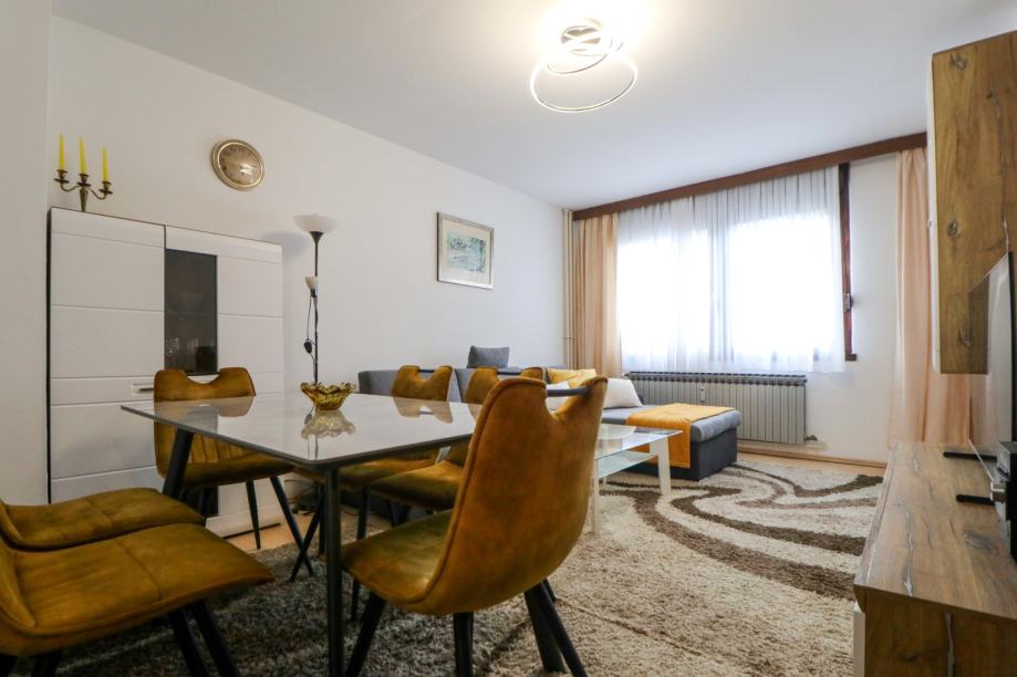 U potpunosti je namješten i opremljen kvalitetnim namještajem (dio namještaja je potpuno nov), protuprovalnim vratima, perilicom rublja, hladnjakom s ledenicom, pećnicom, napom, štednjakom i sl. U stanu će se postaviti klima, a do ulaska novog najmoprimca spavaća soba će biti opremljena novim bračnim krevetom i ormarom.