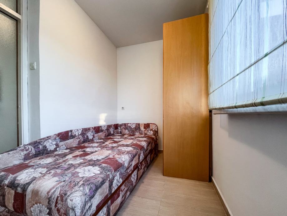 Stan je topao je i pun svjetla. Površine je 58 m2, a sastoji se od hodnika, prostranog dnevnog boravka s izlaskom na loggiu, izdvojene blagovaonice, odvojene kuhinje, kupaonice s toaletom te dvije spavaće sobe. Loggia ima lijep pogled i osunčana je.