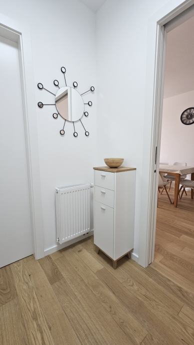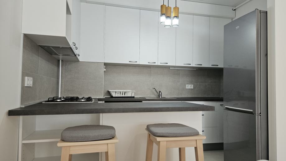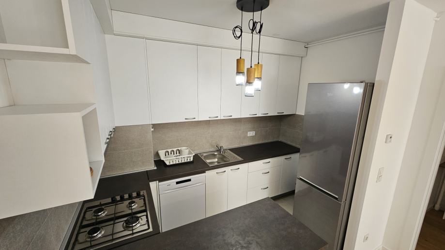 Kuhinja je izrađena po mjeri i opremljena novim uređajima (plinska ploča za kuhanje,napa, pećnica, prostrani hladnjak s ledenicom, perilica posuđa). Stol za blagovanje je dimenzija 90x90 s mogućnosti razvlačenja na 180x90.