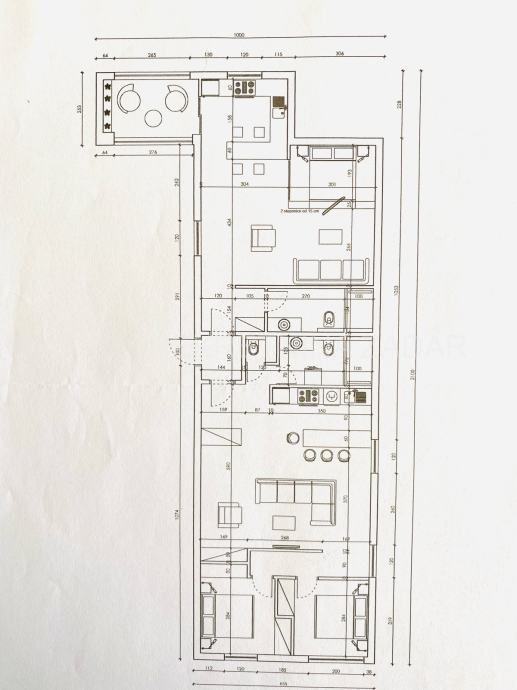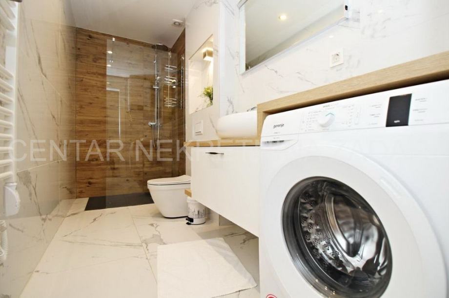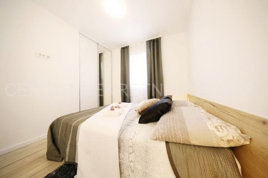 Smješten je na trećem katu stambene zgrade izgrađene 2017. g. Tlocrtna površina mu je 135 m², dok stambena neto površina iznosi 112 m². Stan je u naravi podijeljen na dvije stambene jedinice. Jedan apartman sastoji se od kuhinje s blagovaonom i dnevnim boravkom, dvije spavaće sobe, kupaonice i WC-a. Drugi apartman je luksuzni prostrani studio s lođom. Oba su apartmana opremljena modernim namještajem većinom rađenim po mjeri, s nekoliko ugradbenih ormara i vrhunskim uređajima bijele tehnike, što je sve uključeno u cijenu. U svakom je klima uređaj, a u kupaonicama podno grijanje.
