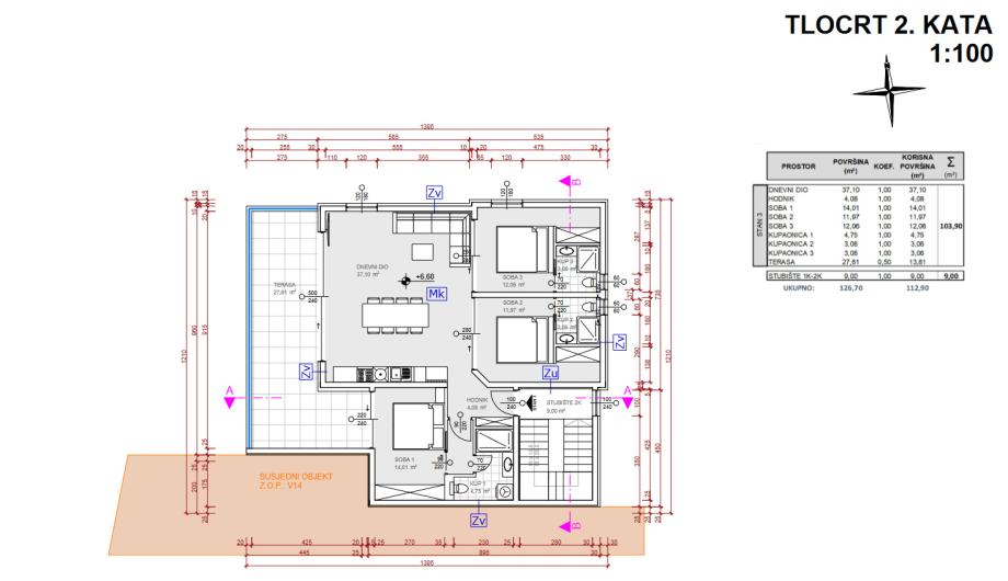 Ovaj stan se nalazi na posljednjem, drugom katu zgrade sjever i prostire se na 103,90 m2. Sastoji se od tri spavaće sobe, od kojih svaka soba ima svoju kupaonicu, te dnevnog prostora koji objedinjuje kuhinju s blagovaonicom i dnevnim boravkom, iz kojeg se pristupa na predivnu vanjsku terasu veličine 27,61 m2, dok stepenice vode na krovnu terasu sa privatnim bazenom. Stanu pripadaju i dva garažna mjesta, kao i spremište, zajedno sa vanjskim nenatkrivenim parkirnim mjestom.