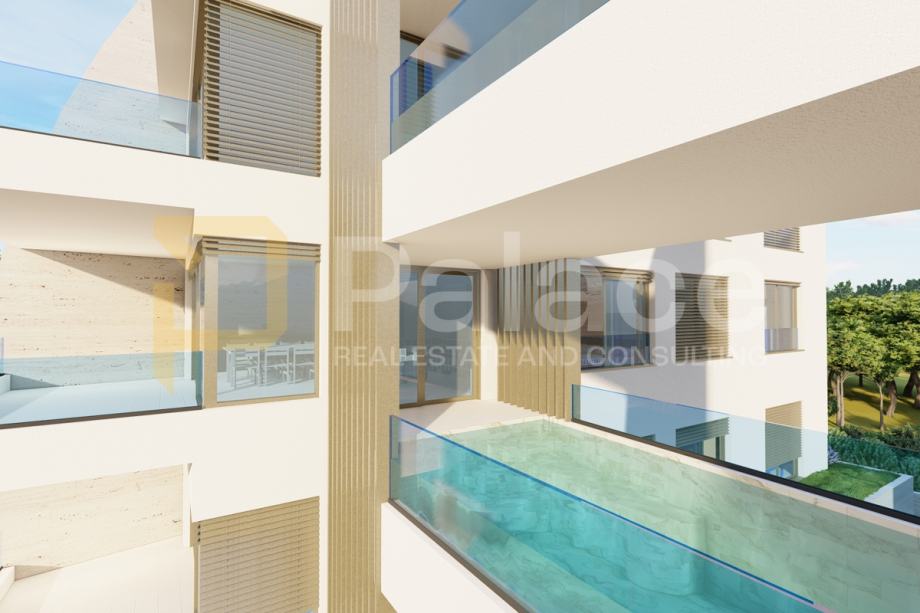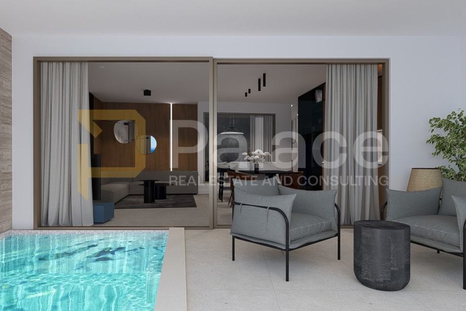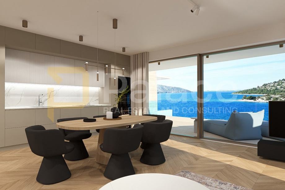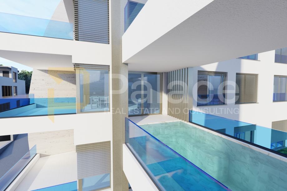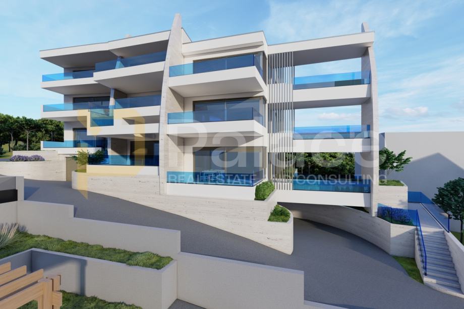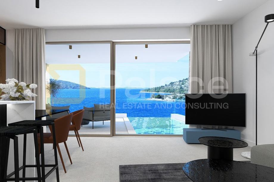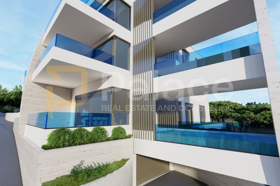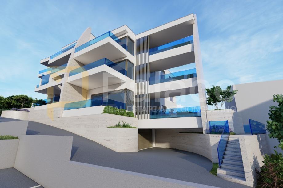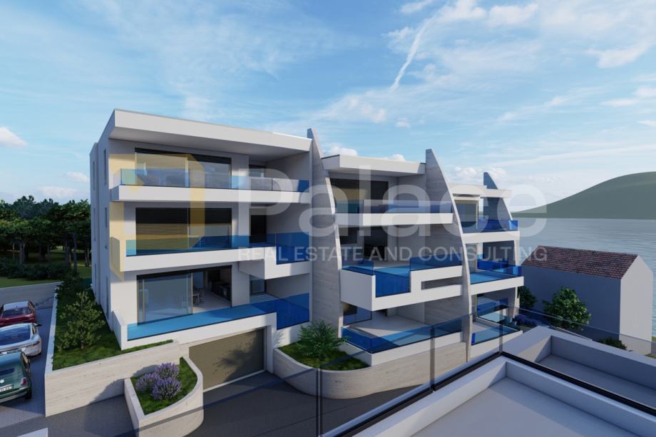 Smješten na samoj obali, svega 40 m od mora, sa privatnim bazenom i luksuznom opremljenošću, ovaj stan pruža budućem vlasniku puža maksimalnu blagodat uživanja. Zgrada se gradi po visokim standardima gradnje, kvalitetnim materijalima, a između ostalog stanovi su opremljeni PVC stolarijom sa velikim kliznim stijenama, klimatiziranim prostorijama, električnim roletama s komaricama, podnim grijanjem itd. Cijela zgrada povezana je s liftom.