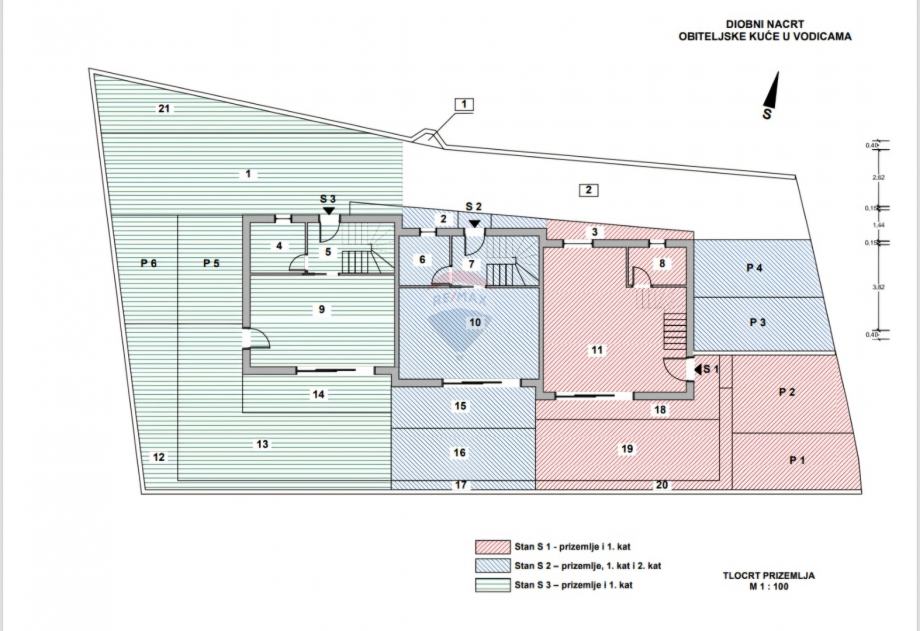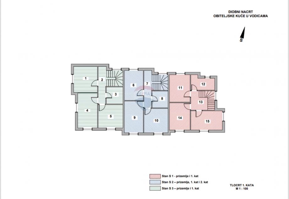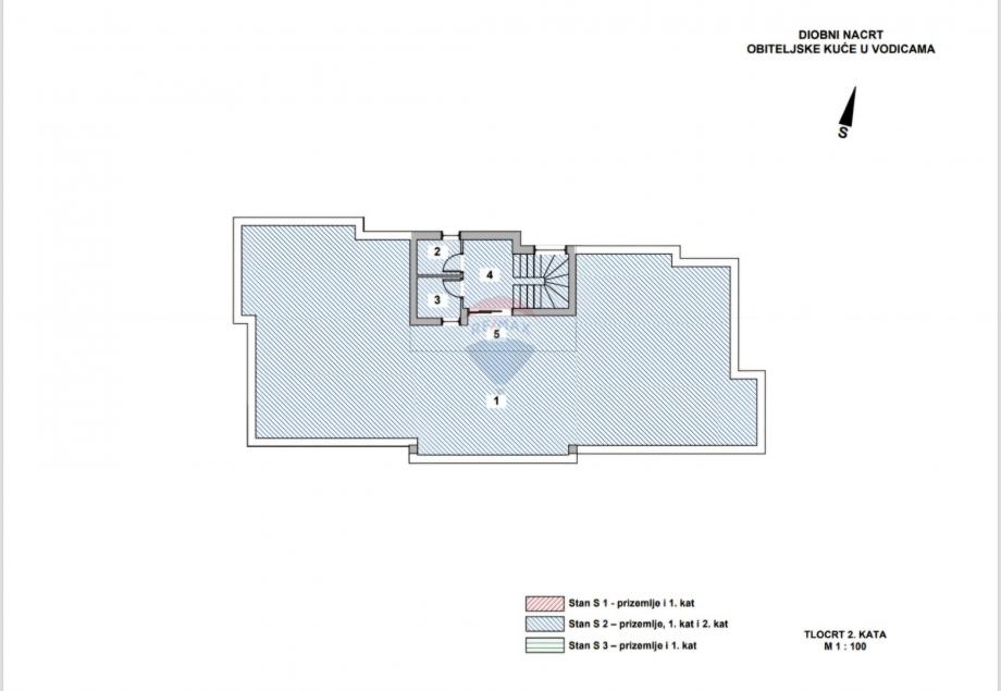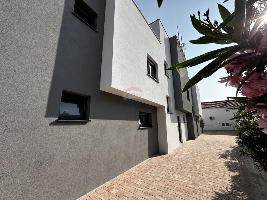 Prodaje se jedinstvena kuća S2 u nizu pored plaže, u blizini centra Vodica. Kuća ukupne površine 171.36m2 proteže na tri etaže. U prizemlju se nalazi kuhinja spojena s blagovaonicom i dnevnim boravkom te kupaonica s toaletom. U prizemlju se nalazi natkrivena terasa površine 12.64m2 te nenatkrivena terasa veličine 16m2.