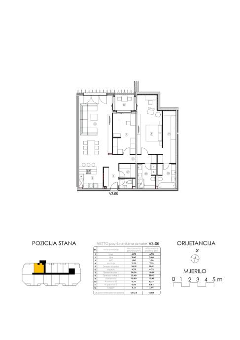 STAN V3 - 6 - nalazi se na 3.katu zgrade, sastoji se od ulaznog prostora, wc-a, izbe, dnevnog boravka, kuhinje s blagovanom, garderobe, dvije spavaće sobe, dvije kupaonice, hodnika, loggie, SVEUKUPNO 123.15 m2!