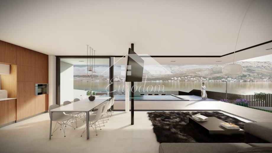 Na otoku Pagu, prvi red do mora, nalazi se predivna luksuzna vila s prostranim infinity bazenom koji nježno prelazi u horizont, stvarajući bajkoviti prizor. Ova nekretnina nudi neto korisnu površinu od 184,24 četvornih metara, smještena na prostranoj parceli od 521 četvornih metara. Vila se prostire na prizemlje i prvi kat, te uključuje parkirna mjesta za dva vozila. Bazen, koji se prostire na impresivnih 11x4 metra, čini središnji fokus dvorišta.