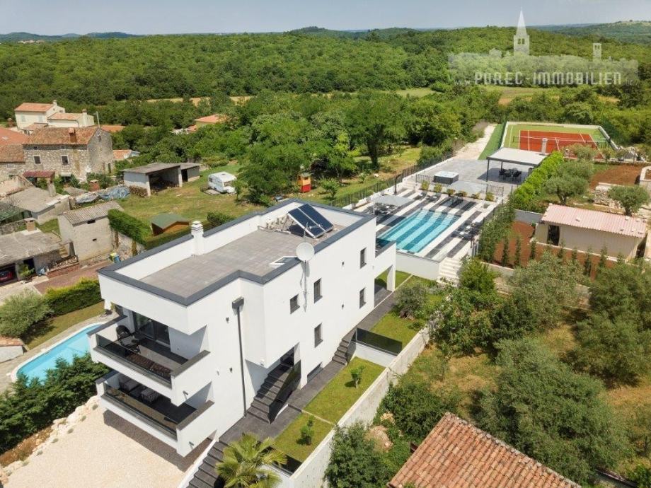U malome istarskom mjestu nedaleko od Vrsara i Limskog zaljeva na zemljištu veličine 3790 m2 smjestila se ova jedinstvena moderna vila sa velikim bazenom, teniskim terenom i prekrasnim pogledom na more.