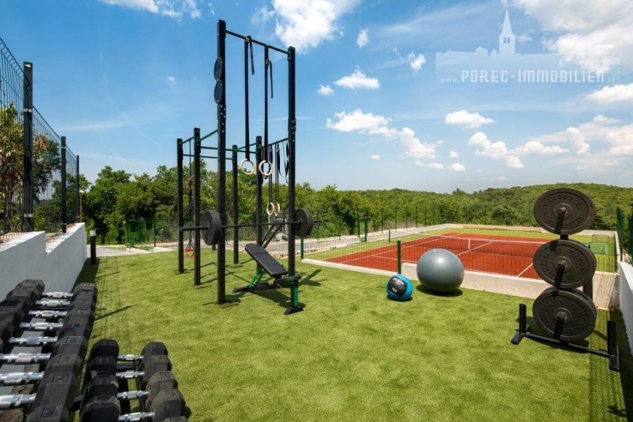 Uz grijani bazen veličine 44 m2 nalazi se veliko sunčalište, u nastavku se dolazi do jacuzzija, vanjske kuhinje te otvorene teretane, a na samom kraju zemljišta smješten je privatni teniski teren.