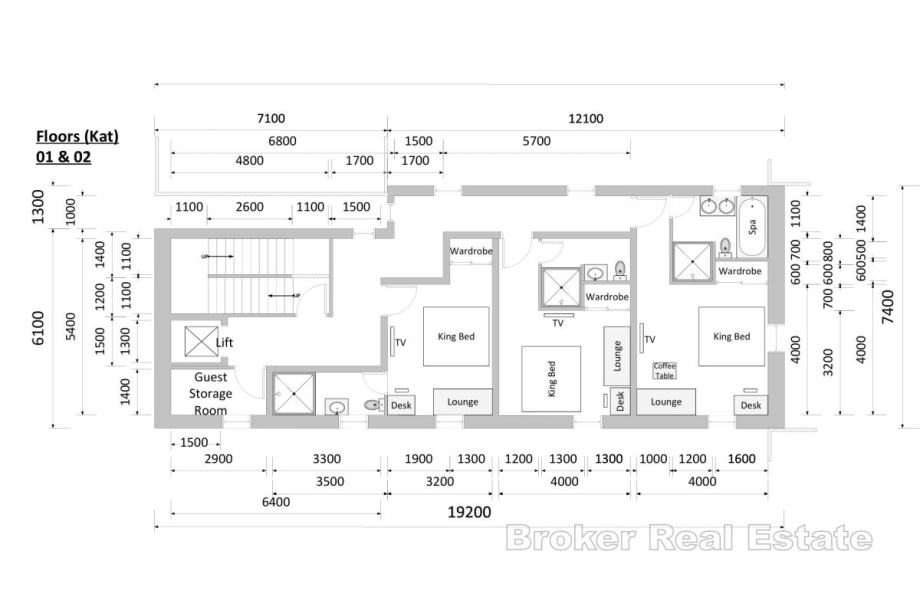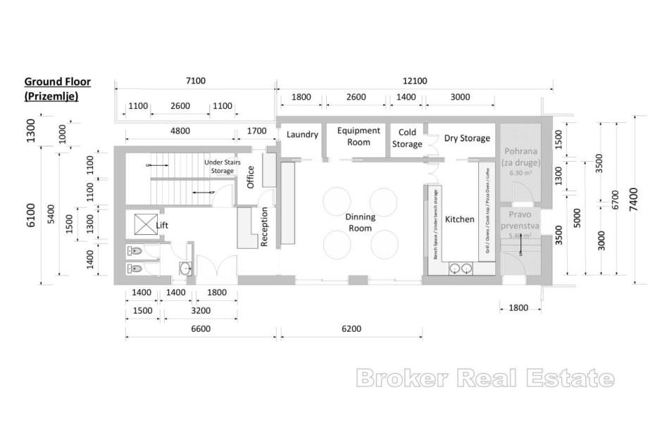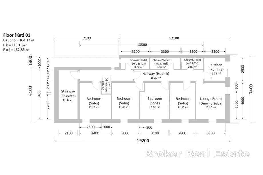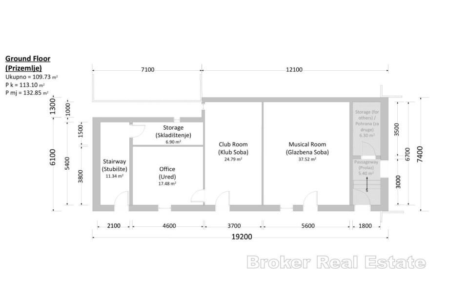 Na prvoj etaži smještene su tri prostrane prostorije te ostava, što pruža mogućnost uređenja poslovnog prostora, ureda ili ugostiteljskog objekta. Unutarnje stepenište vodi na prvi kat gdje se nalaze četiri komforne spavaće sobe, prostrani dnevni boravak, potpuno funkcionalna kuhinja, tri kupaonice te hodnik koji povezuje sve prostorije u skladnu cjelinu.