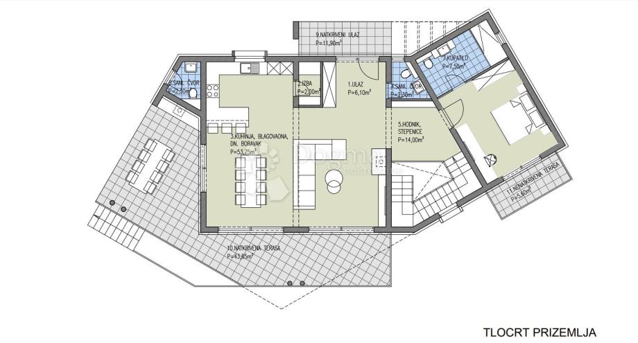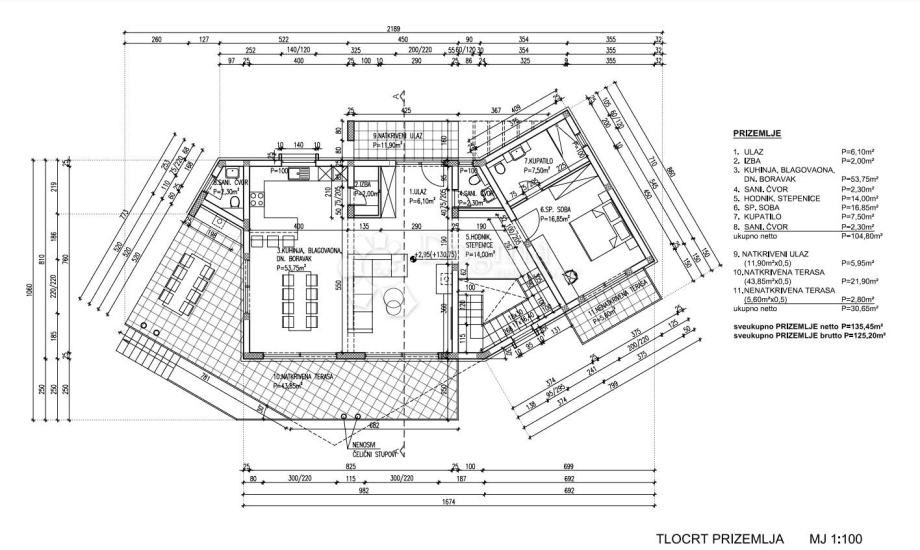 Prizemlje kuće prostire se na 135,45 m² i uključuje prostranu kuhinju, dnevni boravak te jednu spavaću sobu sa svojom kupaonicom, što osigurava udoban i privatni prostor. Dodatno, tu su i dva zasebna WC-a, što je idealno za obiteljski život ili goste.