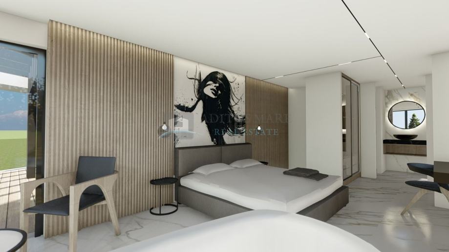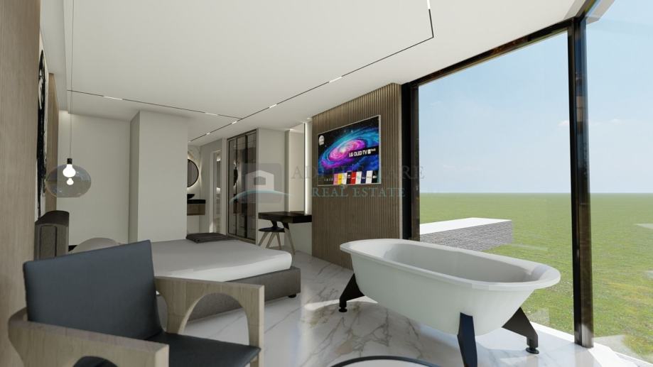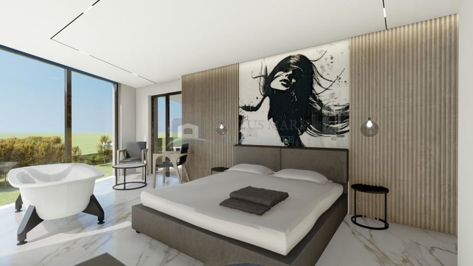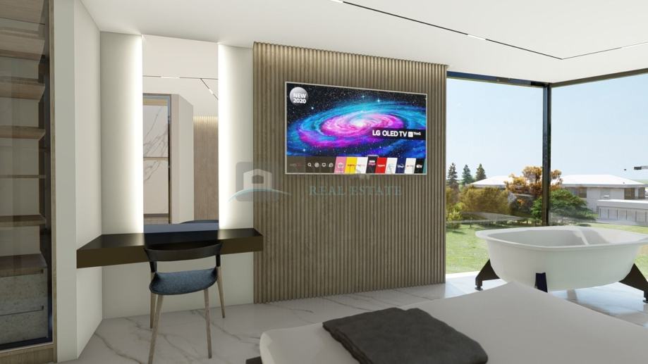 Vila se prostire na tri etaže i sastoji se od četiri prostrane spavaće sobe, svaka sa svojom modernom kupaonicom, uz dodatni gostinjski toalet za maksimalnu udobnost. Interijer je otvoren i svijetao, s velikim staklenim stijenama koje povezuju unutarnji prostor u kojem se nalazi open space dnevni prostor spojen je s elegantnom, potpuno opremljenom kuhinjom iz koje se izlazi na impozantnu terasu s infinity bazenom i integriranim jacuzzijem, idealnim za opuštanje i uživanje u pogledu koji ostavlja bez daha.