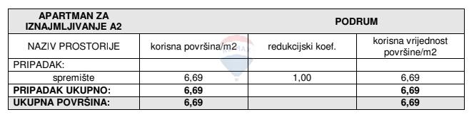Apartman je površine 44,06 m2 + pripadajuće spremište od 6,69 m2 u podrumu zgrade + jedno parkirno mjesto.