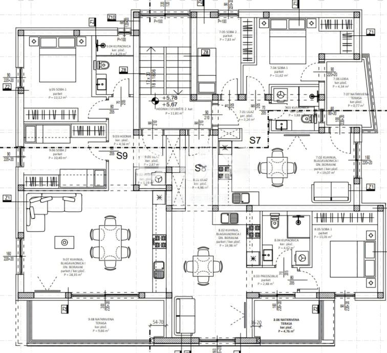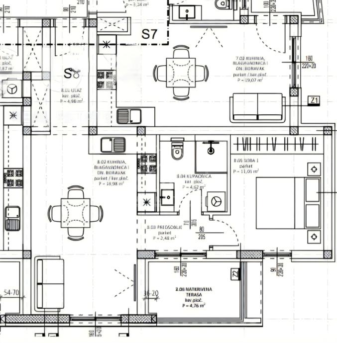 STAN S8 NA 2. KATU, JEDNOSOBAN, sadrži: hodnik (pov. 4.98 m2), dnevni boravak s blagovaonicom i kuhinjom (pov. 19.98 m2), predsoblje (pov. 2.40 m2), spavaću sobu (pov. 11.05 m2), kupaonicu (pov. 4.62 m2) i natkrivenu terasu (pov. 5.11 m2). Ukupno: 46.86 m2.