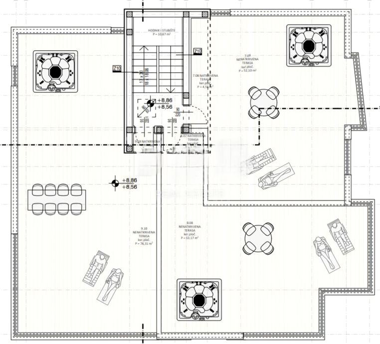 Na krovnim terasama će biti izvedena priprema za jacuzzi i toplu i hladnu vodu.