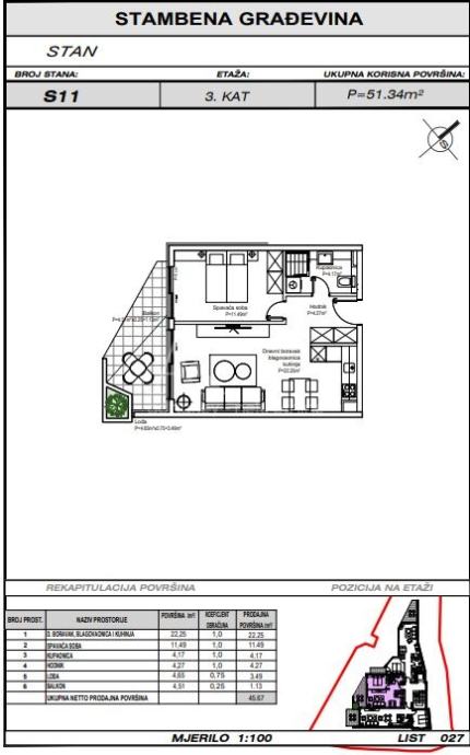 Stan S11- Stan na trećem katu stambenog objekta. Stan se sastoji od jedne spavaće sobe, open space koncepta dnevnog boravka, kuhinje i blagovaonice, kupaonice, hodnika te natkrivenog balkona.