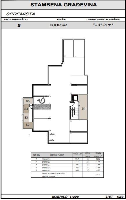 Projekt čini stambena zgrada od 12 manjih stanova raspoređenih na 4 etaže. Podrumska etaža sadrži zajedničku garažu s 10 garažnih mjesta i 5 ostava.