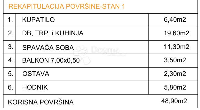 Površina stana iznosi 48,90 m², a sastoji se od:
