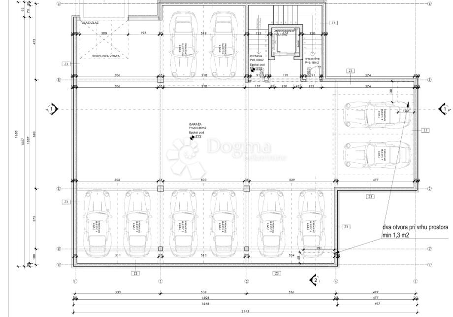 U podrumu se nalazi garaža s 10 parkirnih mjesta, a ispred zgrade dodatna 4 vanjska parkirna mjesta.