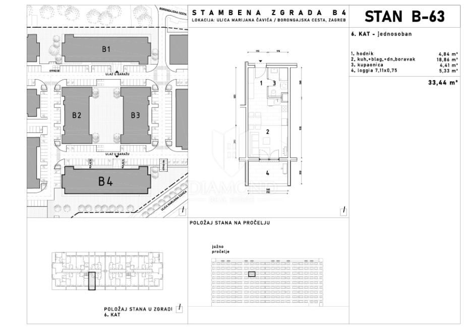 Na prodaju je jednosoban stan od 33,44 m² u modernoj novogradnji čija je izgradnja planirana do kraja siječnja 2027. godine. Smješten odmah preko puta kampusa Borongaj i uz borongajsku šumu, stan predstavlja izvrsnu priliku za stanovanje studenata, parova ili kao sigurna investicija. Cijena stana je 162,184 eura. Uz stan dolazi i garažno mjesto u podzemnoj etaži površine 15 m², a cijena mu je 22,500 eura. Tako da je ukupna cijena stana i garažnog mjesta 184.684 eura.