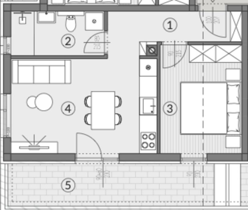 Roh-bau faza je završena, a trenutno je u tijeku postavljanje stolarije. U gradnji se koriste provjereni, visokokvalitetni materijali, uz keramiku prve klase s mogućnošću izbora boja i uzoraka. Kupaonice će biti potpuno opremljene kvalitetnim sanitarijama renomiranih proizvođača. Predviđene su klima jedinice u svim prostorijama, a unutarnja stolarija bit će izvedena na visokom nivou.