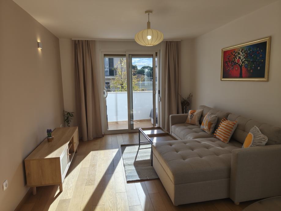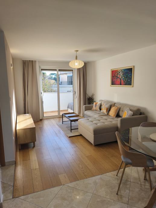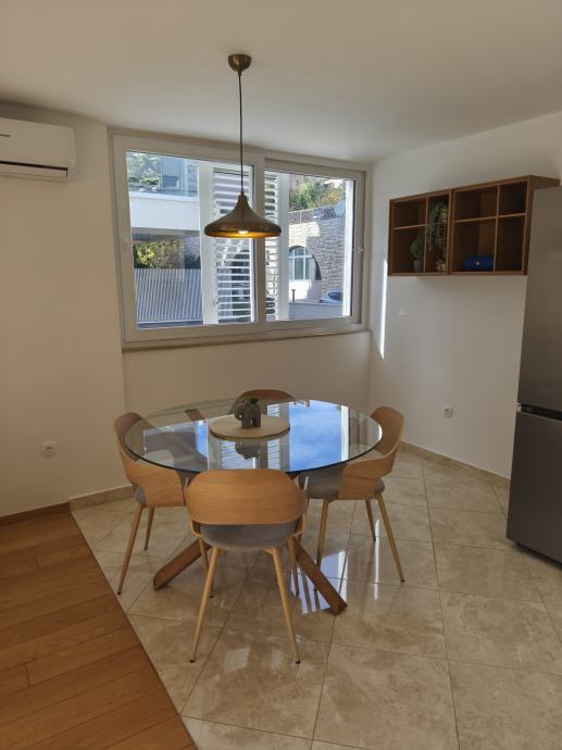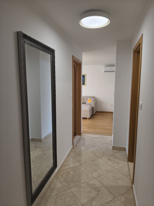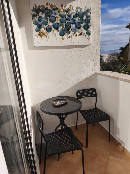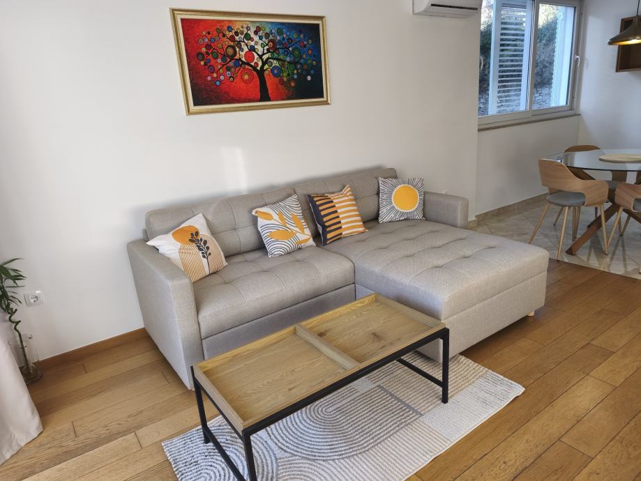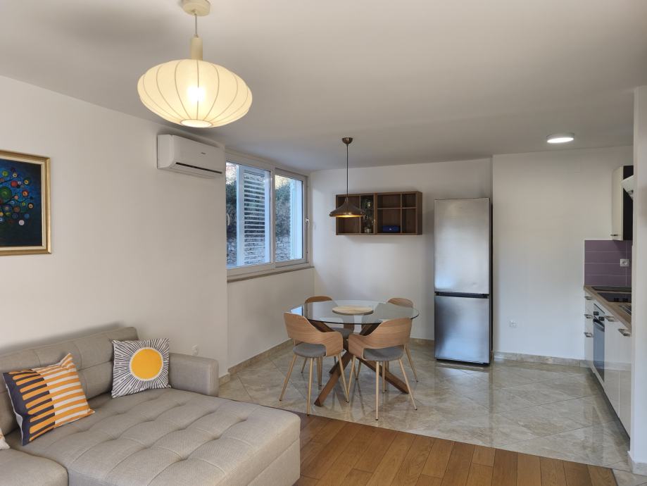 Stan je orijentacije jugo-zapad s pogledom na more i sastoji se od kuhinje sa blagavaonom i dnevne sobe, spavaće sobe, kupatila, predsoblja, balkona i drvarnice. Nalazi se na prvom katu manje zgrade, u jednosmjernoj ulici u kojoj uvijek ima po neko parkirno mjesto.