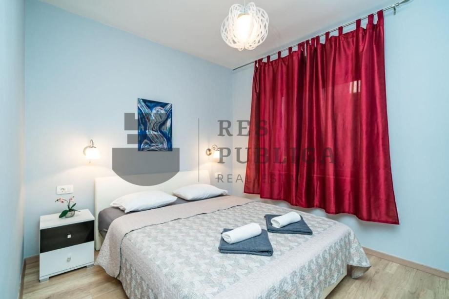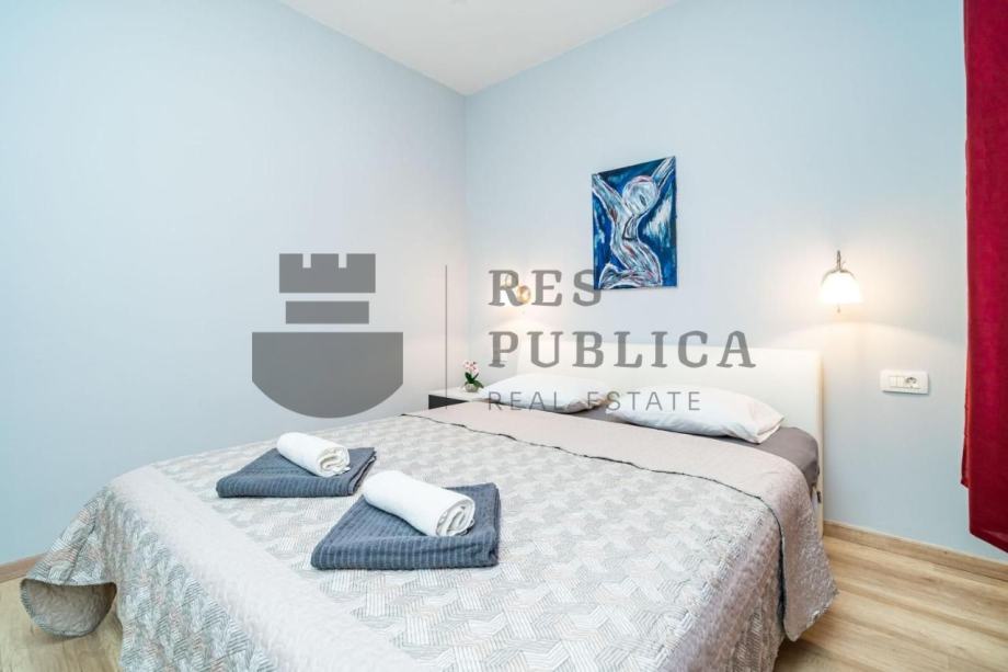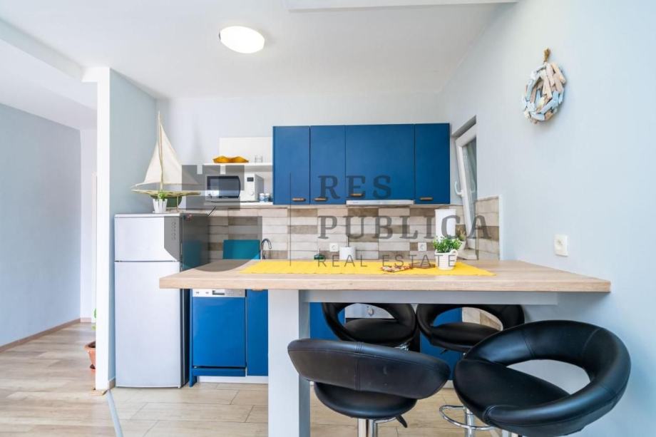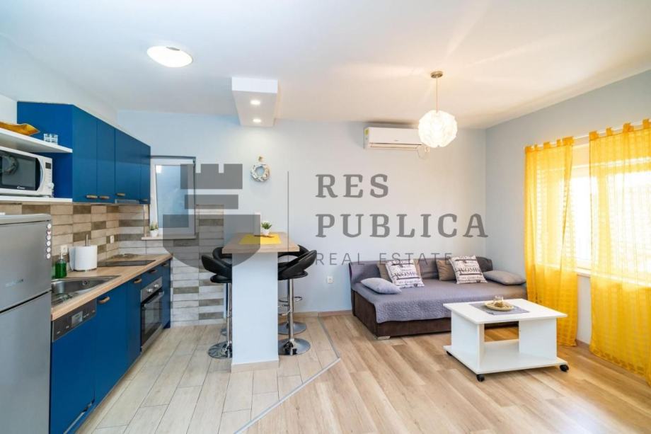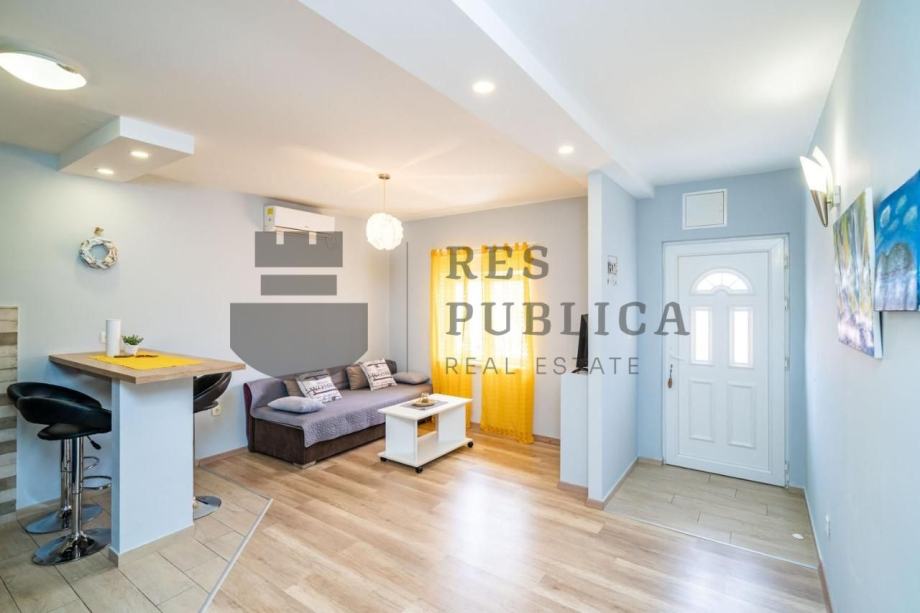 Stan je smješten u prizemlju kuće koja ima tri etaže s ukupno tri stana. Kompletno je obnovljen 2018.godine i sastoji se od kuhinje povezane s dnevnim boravkom, jedne spavaće sobe i kupaonice.