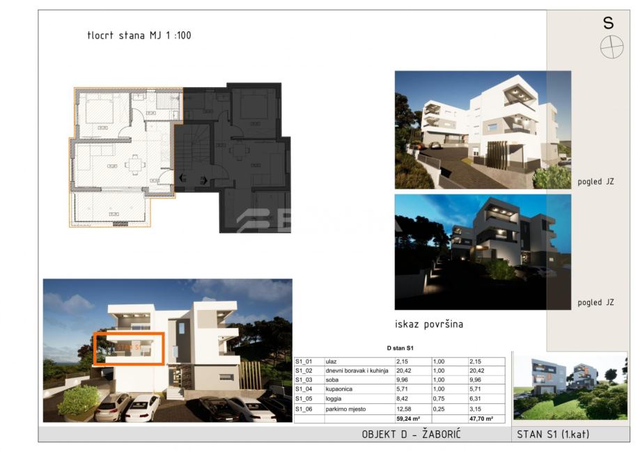 Stan S1 nalazi se na prvom katu zgrade i ima neto obračunsku površinu od 47,70 m². Sastoji se od ulaza, dnevnog boravka s kuhinjom i blagovaonicom, spavaće sobe i kupaonice. Loggia površine 8,42 m² pruža ugodan prostor za boravak na otvorenom. Stanu pripada parkirno mjesto.