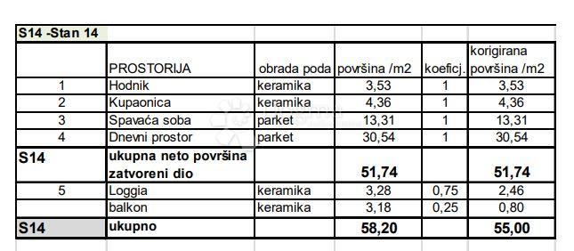 Stan se sastoji od od hodnika, dnevnog boravka s blagavaonicom, 1 spavaće sobe, kupaonice te balkona i loggie.