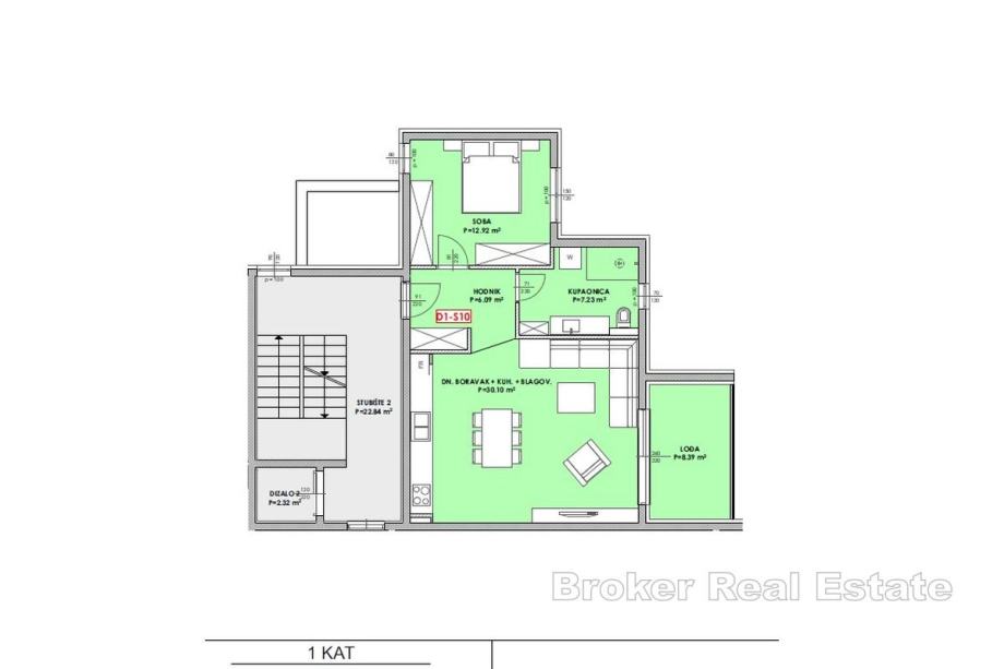 Na prodaju je stan površine 63 m², smješten na prvom katu moderne novogradnje s liftom, u neposrednoj blizini mora. Prostrani dnevni boravak s kuhinjom i blagovaonicom čini srce doma, dok jedna spavaća soba pruža privatnost i udobnost. Iz dnevnog prostora izlazi se na lođu koja nudi intiman kutak za odmor i uživanje na otvorenom uz pogled na more.
