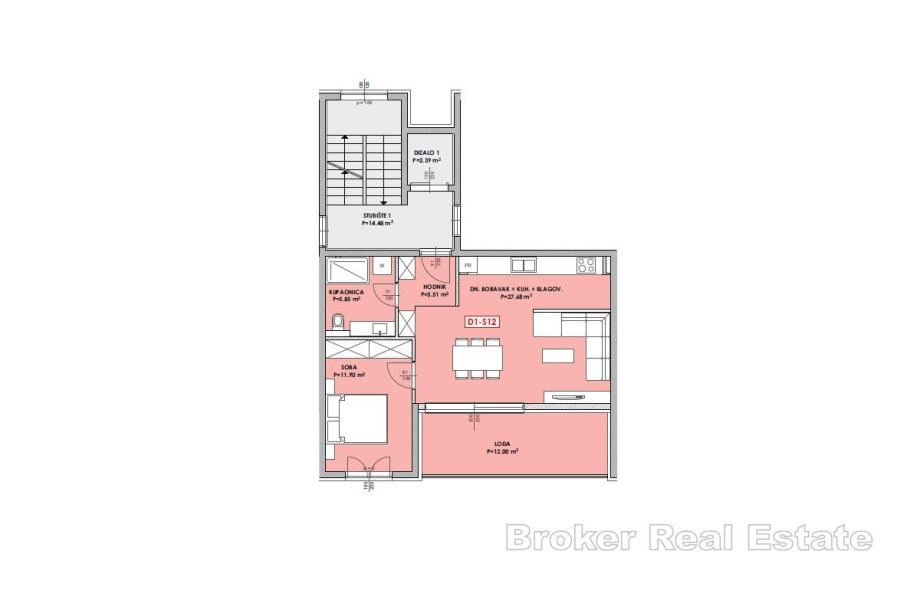 Na prodaju je stan površine 58 m², smješten na drugom katu moderne novogradnje s liftom, u neposrednoj blizini mora. Prostrani dnevni boravak s kuhinjom i blagovaonicom čini centar doma uz jednu spavaću sobu . Iz dnevnog prostora izlazi se na lođu koja nudi intiman kutak za odmor i uživanje na otvorenom uz pogled na more. Stan je južno orijentiran, što osigurava obilje prirodnog svjetla i sunčane topline tijekom cijelog dana.
