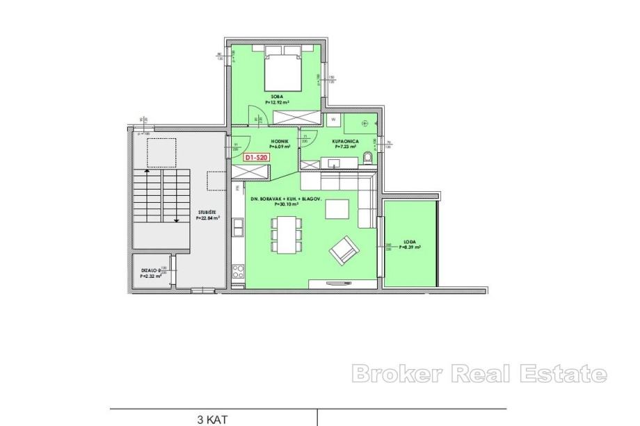 Na prodaju je stan površine 63 m², smješten na trećem katu moderne novogradnje s liftom, u neposrednoj blizini mora. Prostrani dnevni boravak s kuhinjom i blagovaonicom čini centar doma uz jednu spavaću sobu . Iz dnevnog prostora izlazi se na lođu koja nudi intiman kutak za odmor i uživanje na otvorenom uz pogled na more. Stan je južno orijentiran, što osigurava obilje prirodnog svjetla i sunčane topline tijekom cijelog dana.