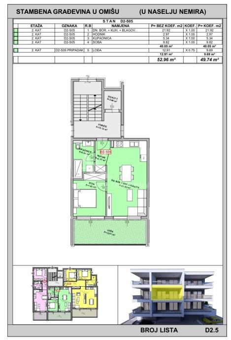 Na prodaju je moderan jednosoban stan, smješten na drugom katu novogradnje, u atraktivnom i mirnom naselju Nemira, svega nekoliko minuta od centra Omiša. Stan ukupne površine 49,74 m², odnosno 52,96 m² korisne površine, odlikuje se suvremenim dizajnom, prostranim rasporedom prostorija i visokim standardom gradnje, što ga čini idealnim za cjelogodišnje stanovanje ili luksuznu investiciju u turizam.