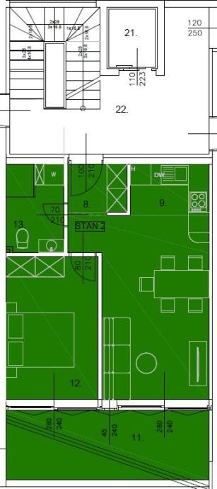 Stan oznake S2 u prizemlju zgrade površine 57.90m2 sastoji se od: hodnika, 1 spavaće sobe s izlazom na loggiu, kupaonice, kuhinje s blagovaonom i dnevnim boravkom s izlazom na loggiu.