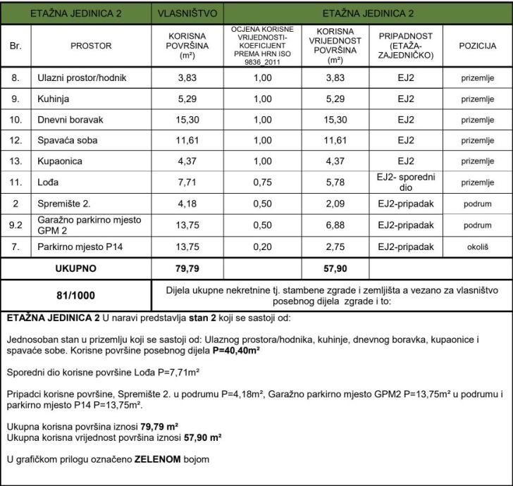 Stanu pripada garažno parkirno mjesto oznake GPM2 površine 13.75m2 te vanjsko parkirno mjeto oznake P14 površine 13.75m2 i ostava u podrumu zgrade oznake SP2 površine 4.18m2.
