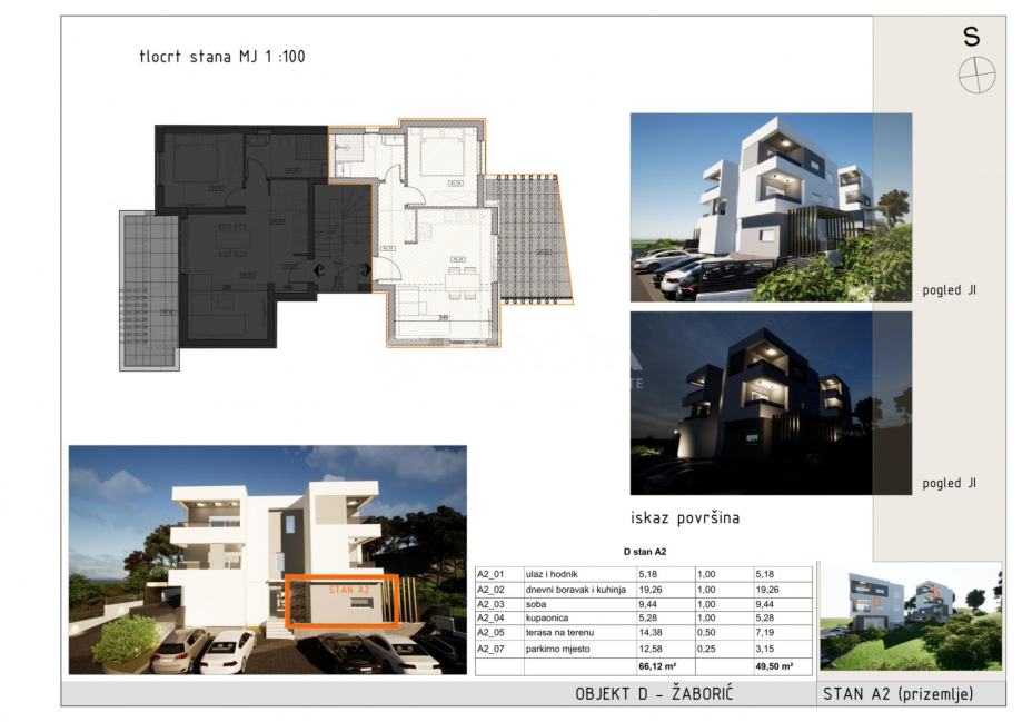 Stan A2 smješten je u prizemlju zgrade i ima neto obračunsku površinu od 49,50 m². Sastoji se od ulaza i hodnika, dnevnog boravka s kuhinjom i blagovaonicom, spavaće sobe i kupaonice. Posebnu vrijednost daje terasa na terenu površine 14,38 m², idealna za boravak na otvorenom tijekom toplih dana. Stanu pripada parkirno mjesto. Nekretnina je pogodna za vlastito korištenje, ali i kao investicija za turistički najam.