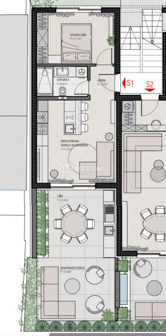 Nalazi se u prizemlju manje zgrade te ima ukupnu neto korisnu površinu od 69.27m2 od čega unutarnja površina stana iznosi 35.86m2, površina lođe 14.59m2, površina natkrivene terase 13,59, te površina vrta 5,23m2. Stan se sastoji od hodnika, jedne spavaće sobe, kupaonice, kuhinje, blagovaonice i dnevnog boravka iz kojeg se izlazi u prekrasnu lođu i vrt.
