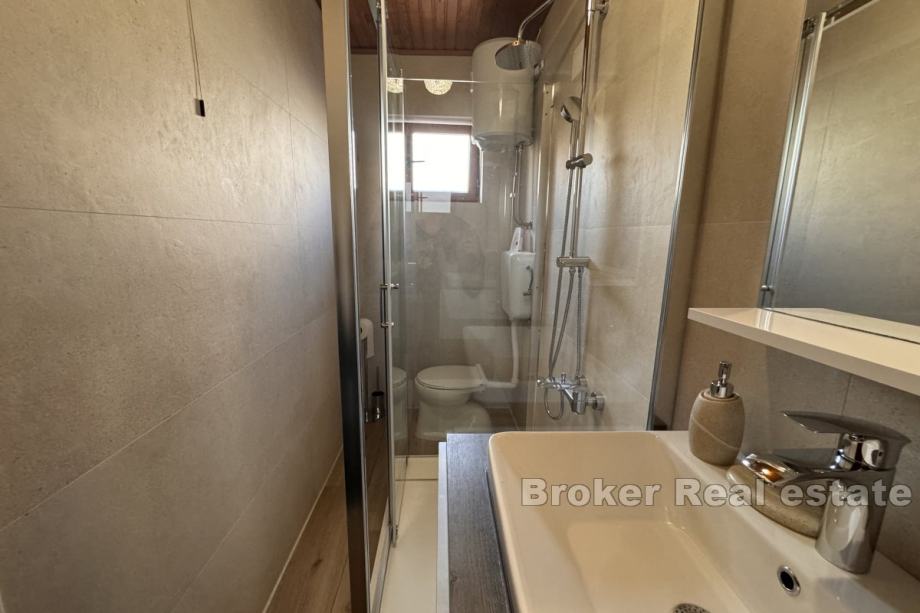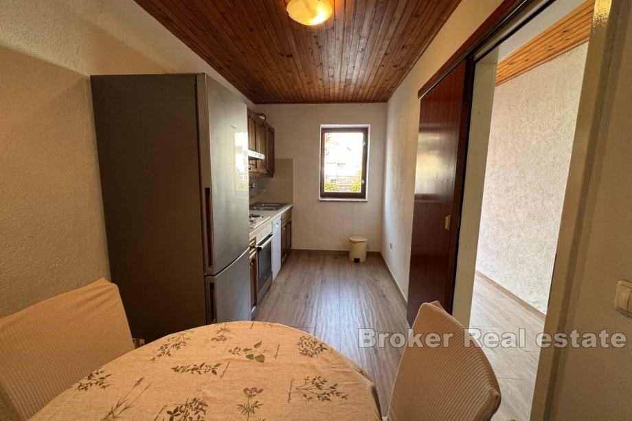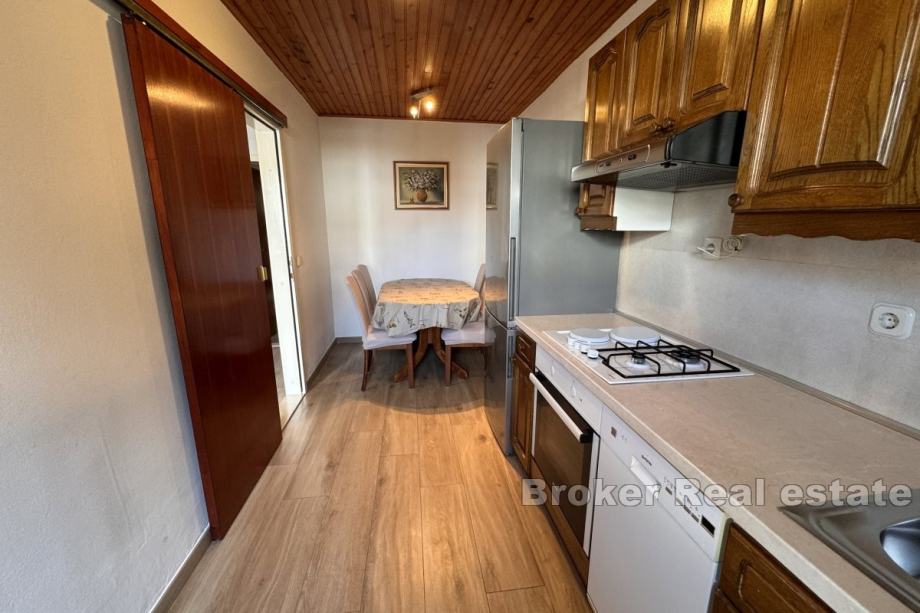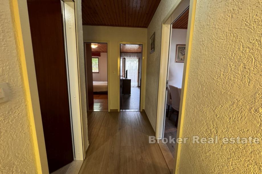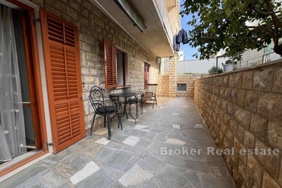 Smješten u prizemlju kuće, prostire se na 46m2 stambene površine s vrtom. Stan se sastoji od hodnika, kuhinje s blagovaonicom, kupatila, dnevnog boravka sa direktnim izlazom u vrt, te jedne spavaće sobe. Cijeli stan je održavan, te se ispred nekretnine nalazi privatni parking. More se nalazi 250 metara od nekretnine. Nalazi se u blizini svih potrebnih sadržaja za život, posebno se ističe svojom mirnom lokacijom. Nisu dozvoljeni kućni ljubimci, režije nisu uračunate u cijenu.